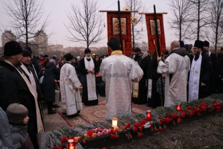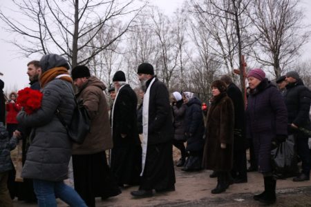 Затем все молящиеся прошли крестным ходом к братским захоронениям, где была совершена заупокойная лития о погибших во время блокады, умерших от ран, глада, хлада, всех воинах, защищавших город, и всех людей, отдавших свою жизнь за Великую Победу.