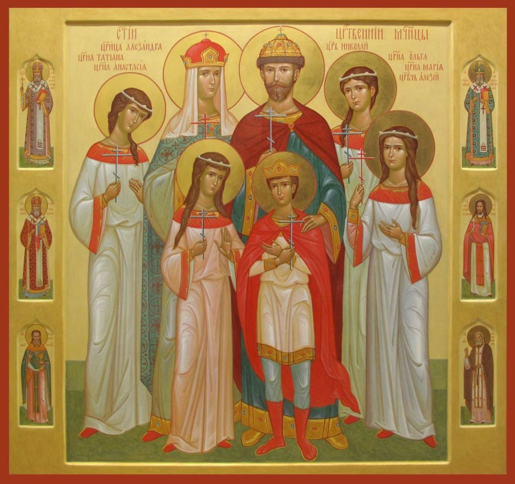Днесь, благове́рнии лю́дие, све́тло почти́м/ седмери́цу честну́ю ца́рственных страстоте́рпец,/ Христо́ву еди́ну дома́шнюю Це́рковь:/ Никола́я и Алекса́ндру,/ Алекси́я, О́льгу, Татиа́ну, Мари́ю и Анастаси́ю./ Ти́и бо, уз и страда́ний многоразли́чных не убоя́вшеся,/ от богобо́рных смерть и поруга́ние теле́с прия́ша/ и дерзнове́ние ко Го́споду в моли́тве улучи́ша./ Сего́ ра́ди к ним с любо́вию возопии́м:/ о святи́и страстоте́рпцы,/ гла́су покая́ния и стена́нию наро́да на́шего вонми́те,/ зе́млю Росси́йскую в любви́ к Правосла́вию утверди́те,/ от междоусо́бныя бра́ни сохрани́те,/ мир ми́рови у Бо́га испроси́те// и душа́м на́шим ве́лию ми́лость.