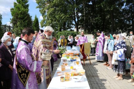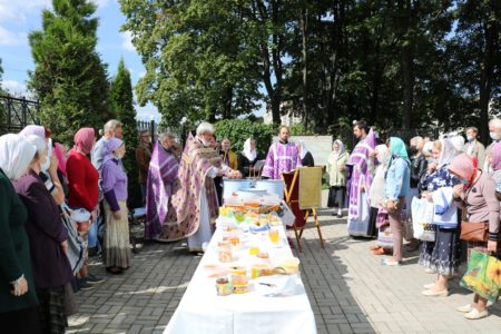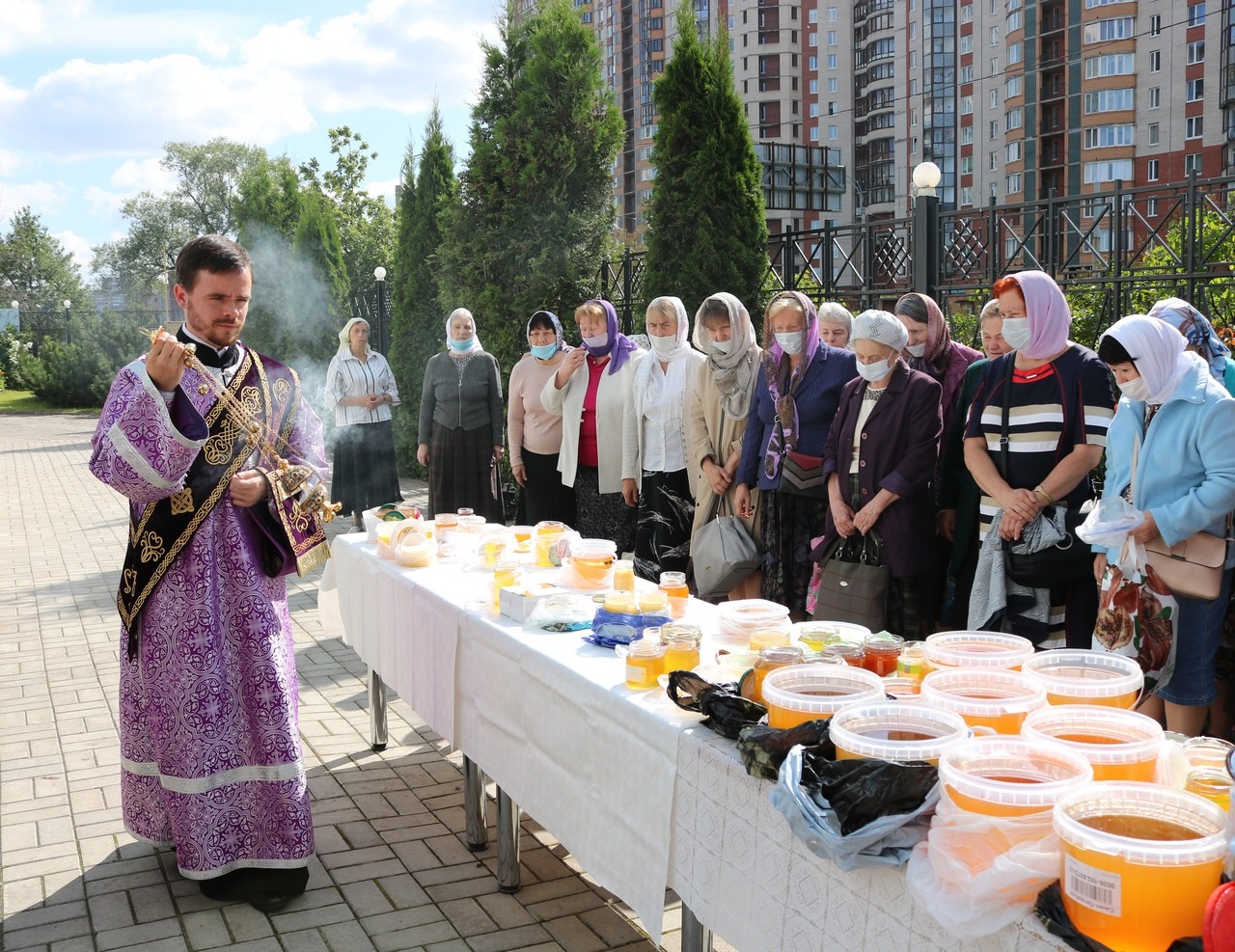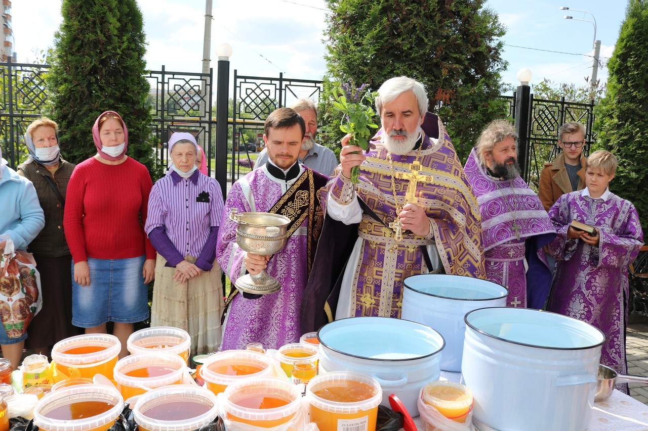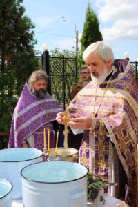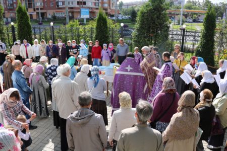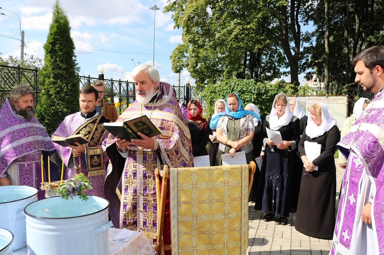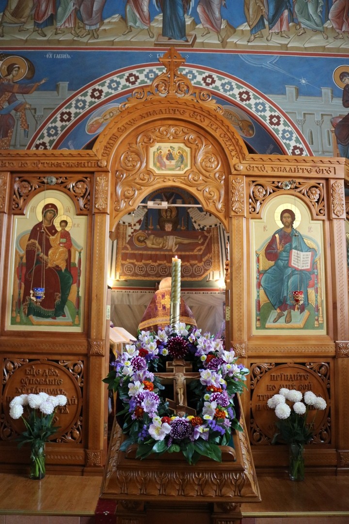 Вознесы́йся на Крест во́лею,/ тезоимени́тому Твоему́ но́вому жи́тельству,/ щедро́ты Твоя́ да́руй, Христе́ Бо́же,/ возвесели́ нас си́лою Твое́ю,/ побе́ды дая́ нам на супоста́ты,/ посо́бие иму́щим Твое́ ору́жие ми́ра// непобеди́мую побе́ду.