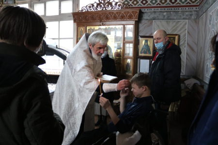 Отец Михаил пообщался с детьми и воспитателями, которые с большим вниманием и радостью участвовали в богослужении, а также подарил крещеному отроку Алексию икону святого, в честь которого был назван мальчик при Крещении — Алексия, человека Божия.