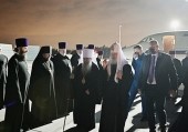 Предстоятеля сопровождают управляющий делами Московской Патриархии митрополит Воскресенский Дионисий, патриарший секретарь архимандрит Алексий (Туриков), руководитель службы протокола протоиерей Андрей Бондаренко.