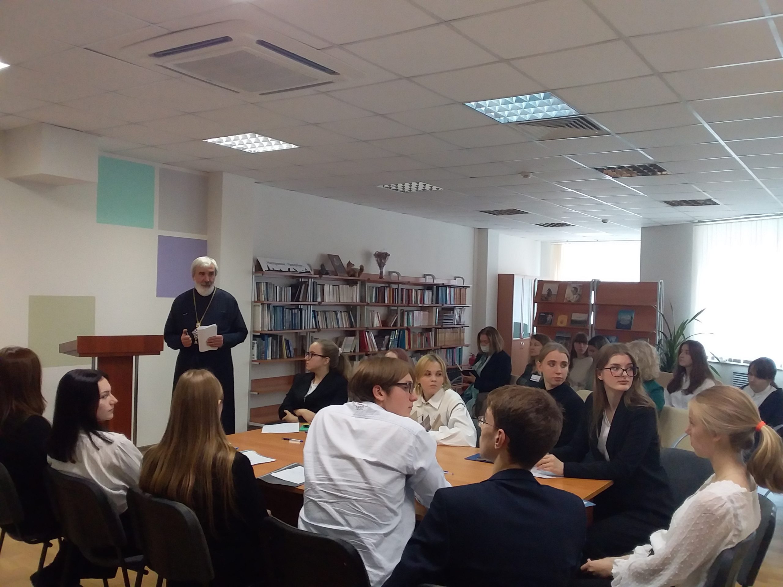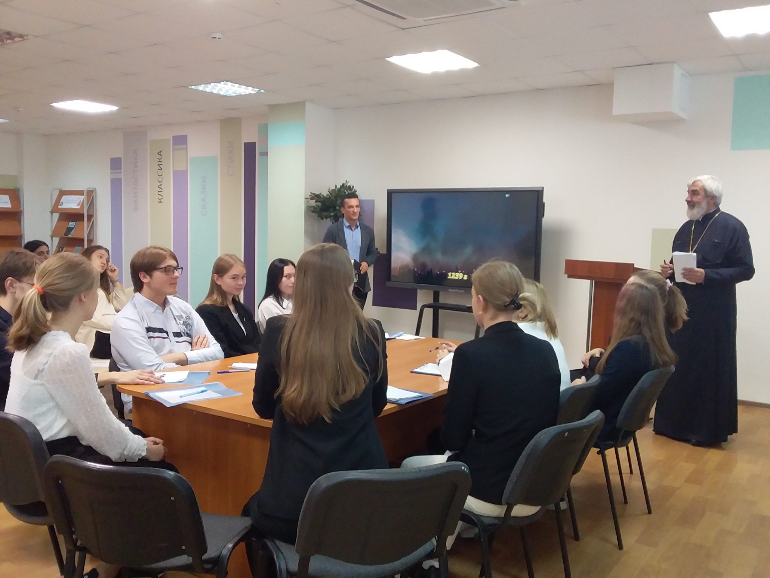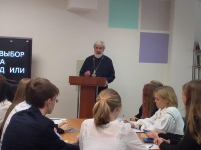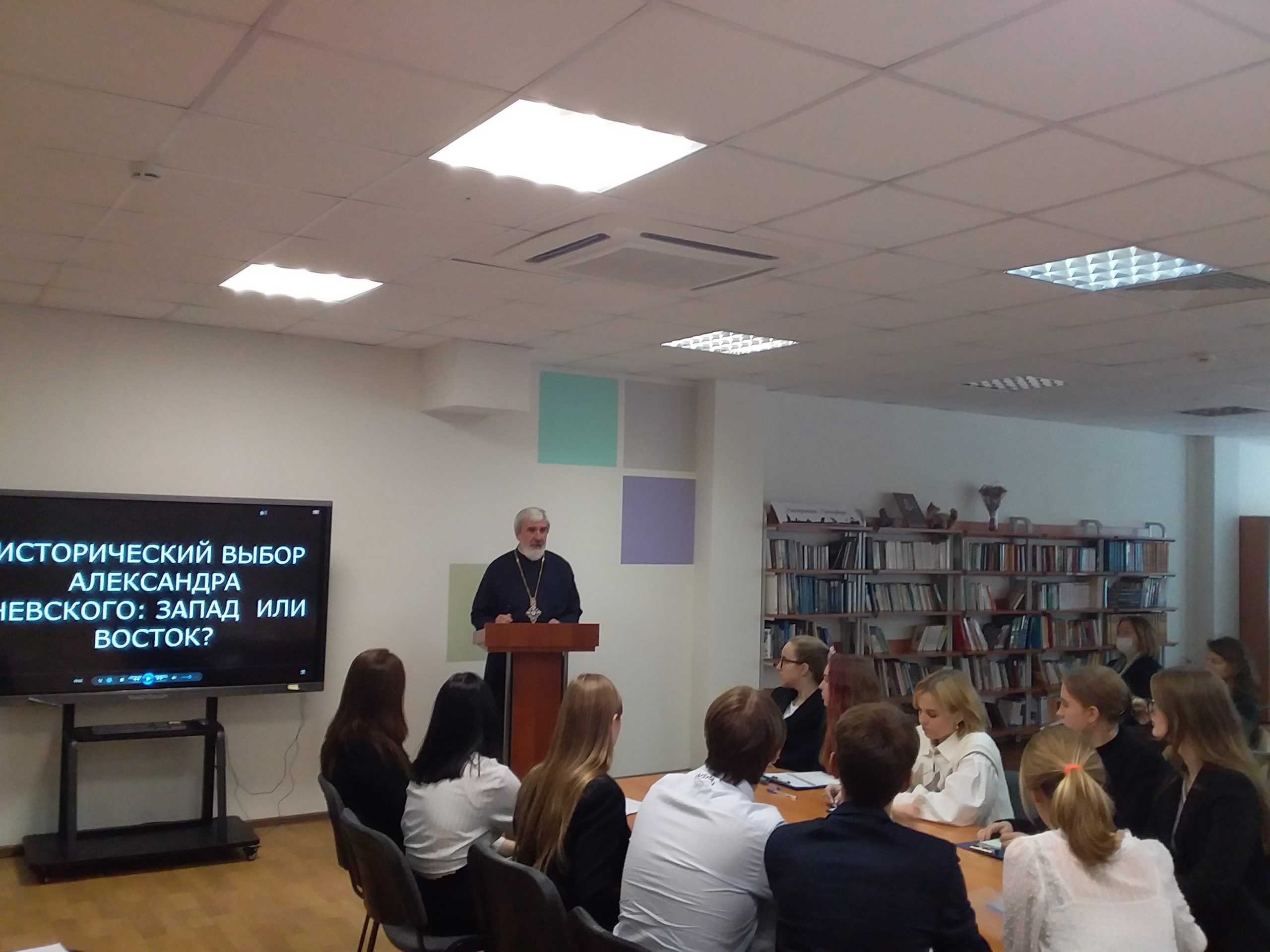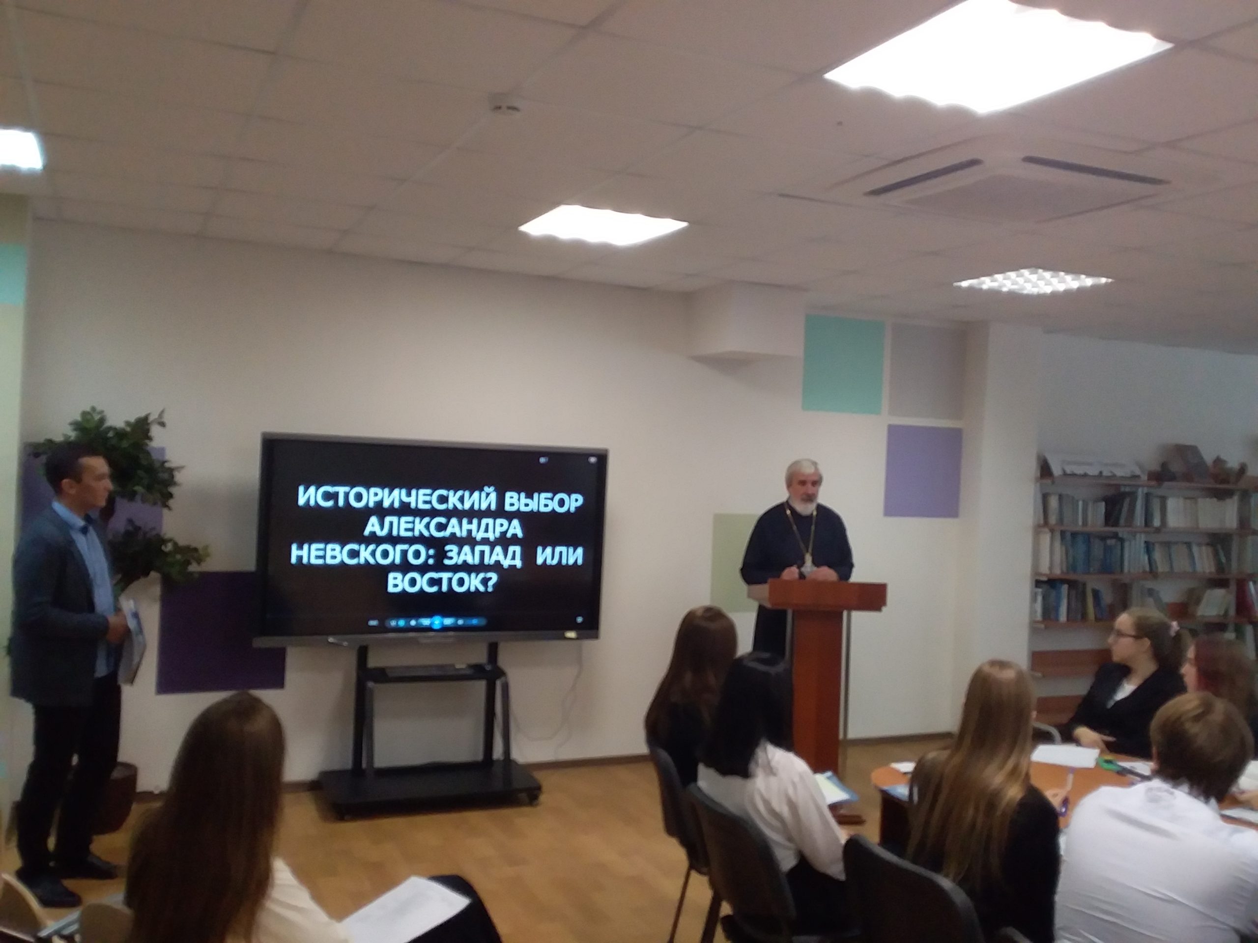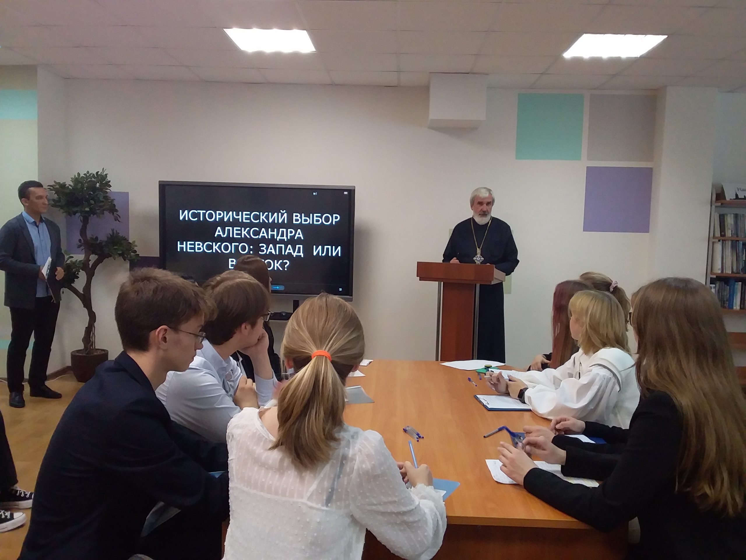 Благочинный Красносельского благочиннического округа протоиерей Михаил Подолей по приглашению директора школы № 546 Красносельского района Куксенко Светланы Михайловны принял участие в открытом уроке по истории. Тема урока: «Исторический выбор Александра Невского: Запад или Восток?». Подготовил урок учитель истории Комиссаров Дмитрий Андреевич совместно с учениками 11-го класса при содействии методиста информационно-методического центра по основам православной культуры Красносельского района Хватковой Эльвиры Рифкатовны.