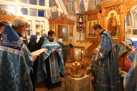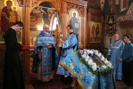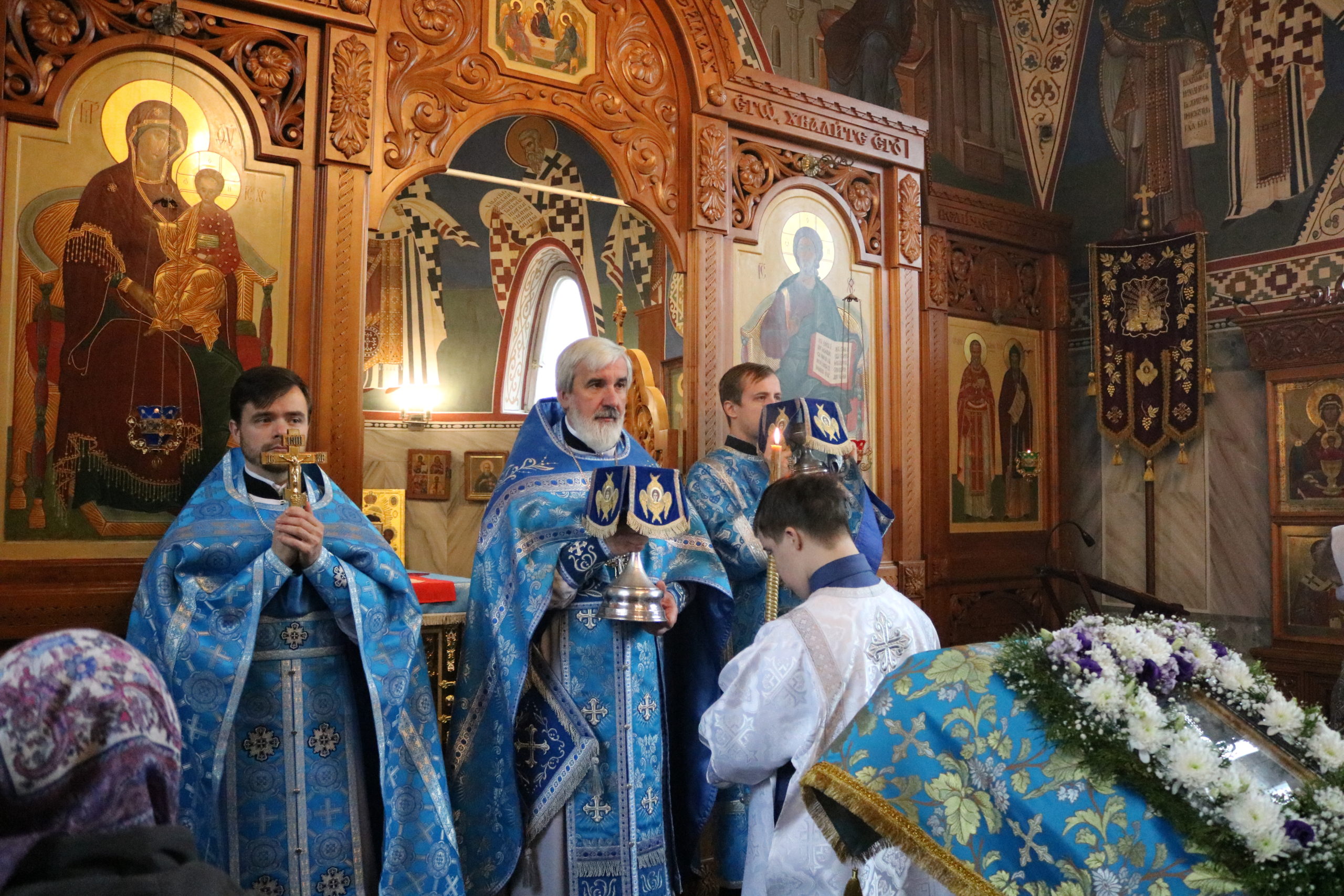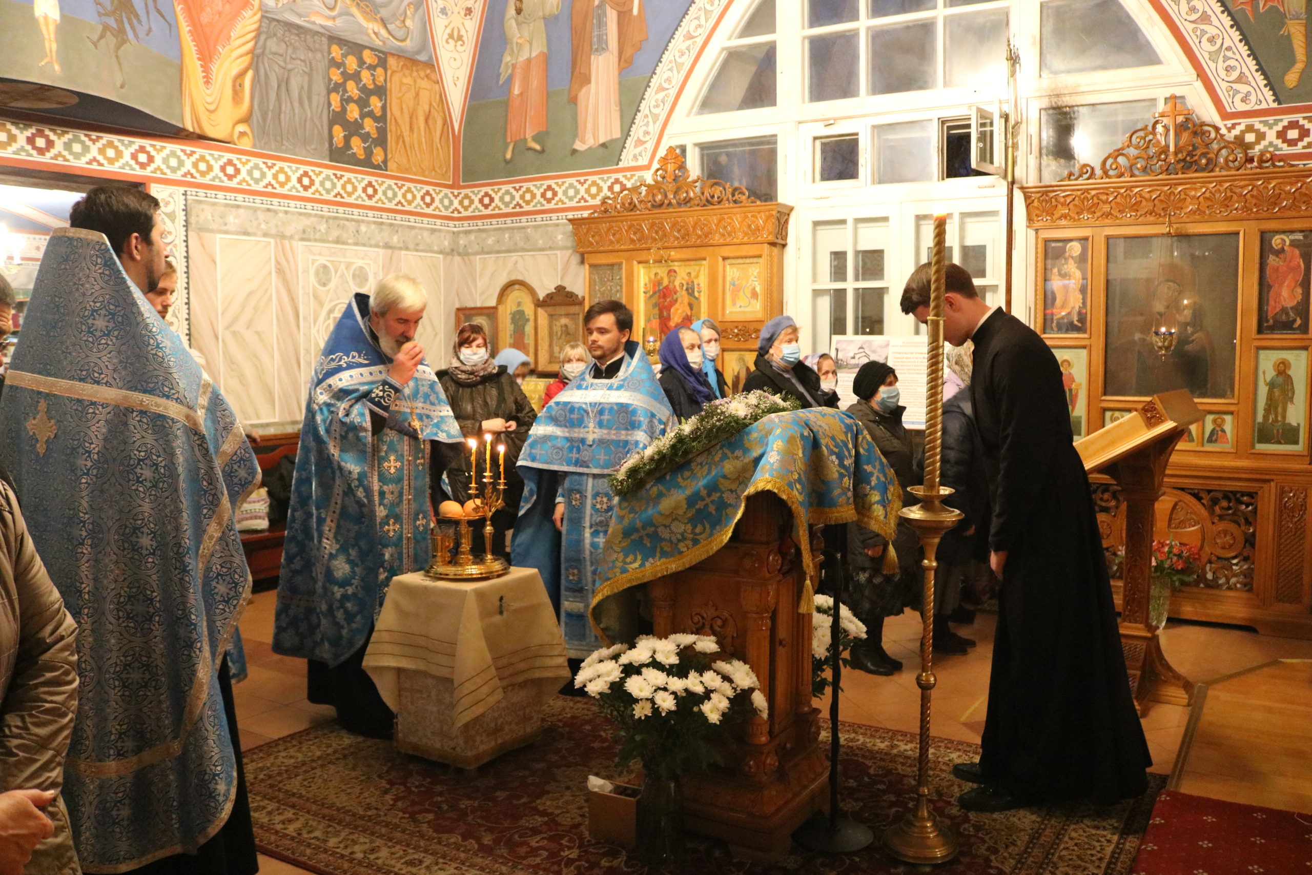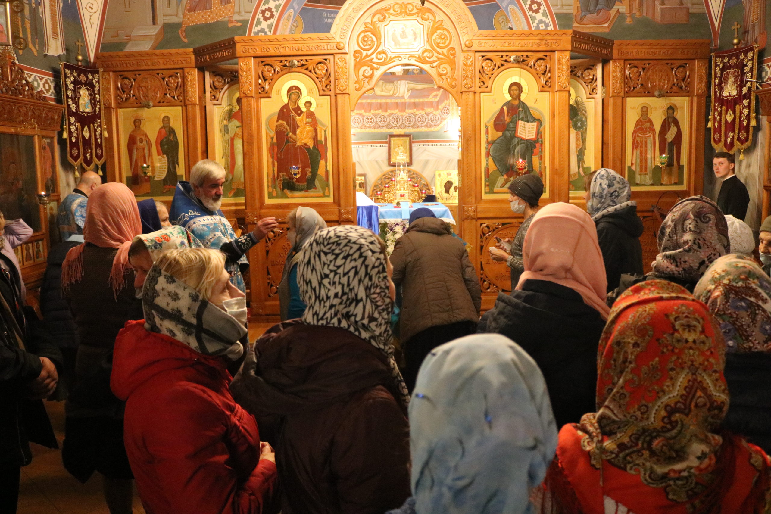 Накануне праздника Всенощное бдение и в сам праздник Покрова Пресвятой Владычицы нашей Богородицы и Приснодевы Марии Божественную литургию в храме святого праведного Иоанна Кронштадтского совершил настоятель протоирей Михаил Подолей в сослужении клира.