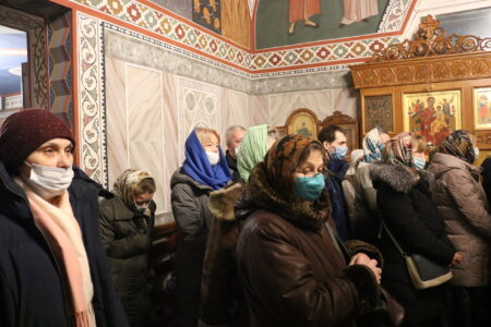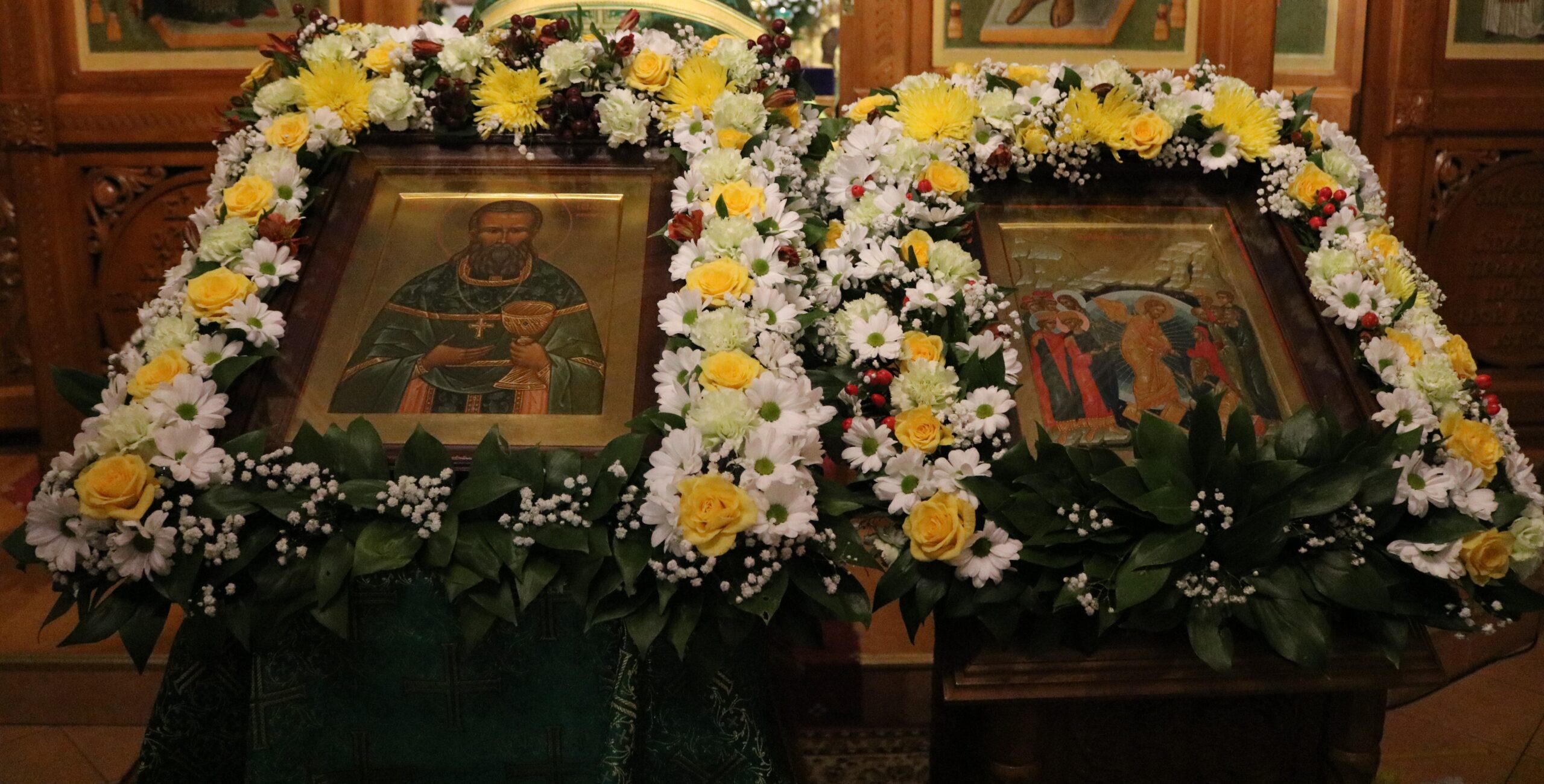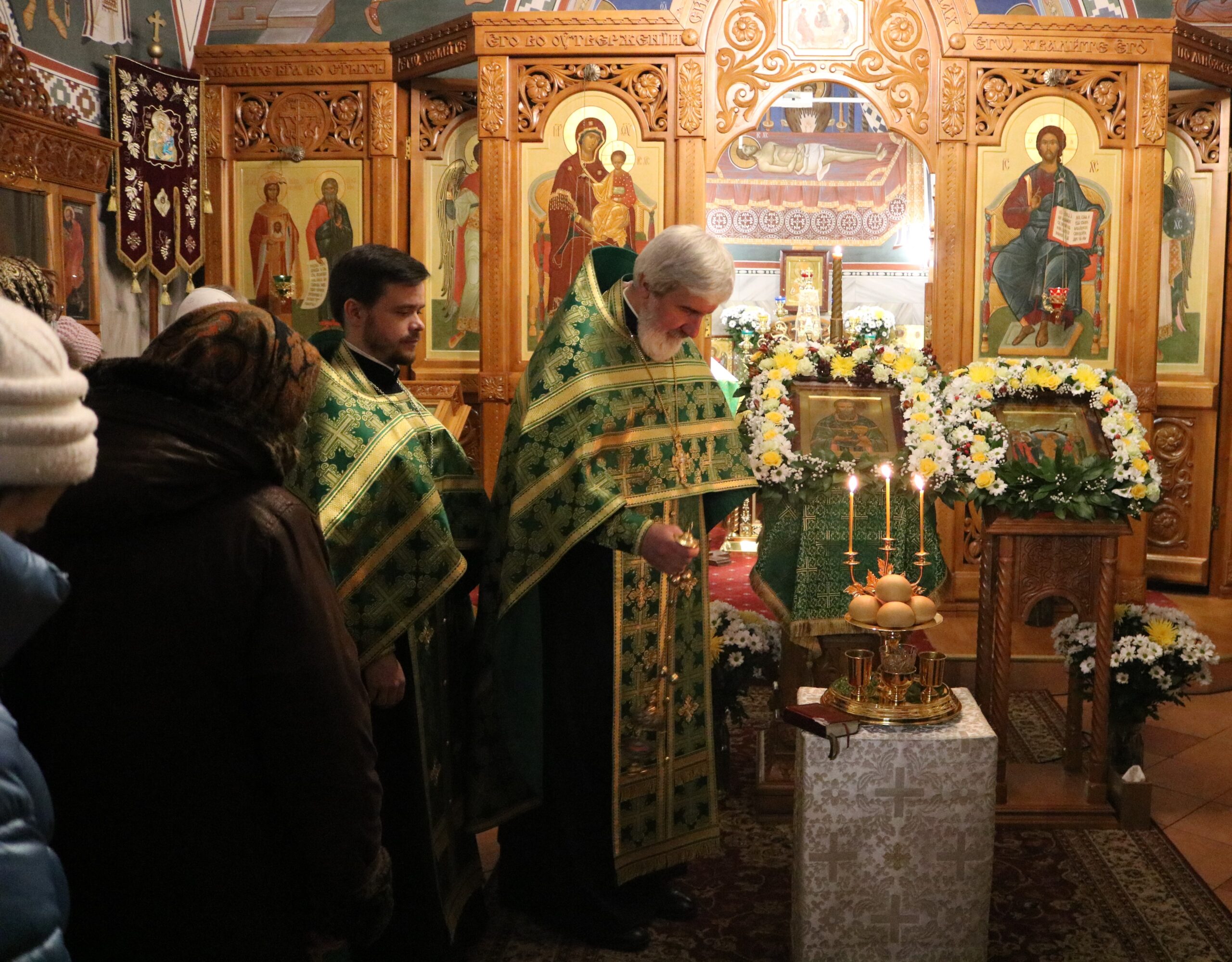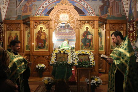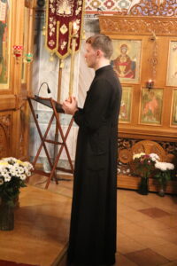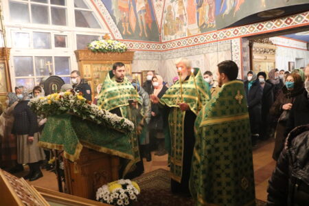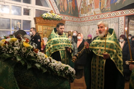 Праздничную Литургию и Всенощное бдение накануне вечером совершил настоятель храма святого праведного Иоанна Кронштадтского на Кронштадтской площади протоиерей Михаил Подолей в сослужении клира.