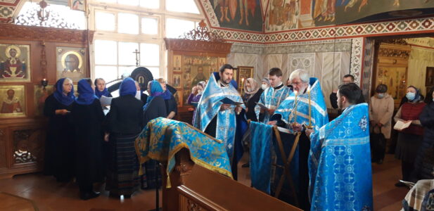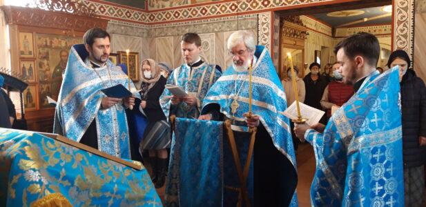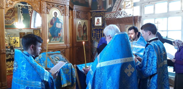 Утреню, накануне вечером и Божественную литургию в храме святого праведного Иоанна Кронштадтского на Кронштадтской площади совершил настоятель храма протоиерей Михаил Подолей. На утрене любительский хор храма под руководством Марины Паниной и профессиональный хор под руководством Льва Михалева спели Акафист Пресвятой Богородицы.