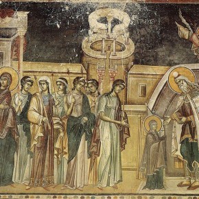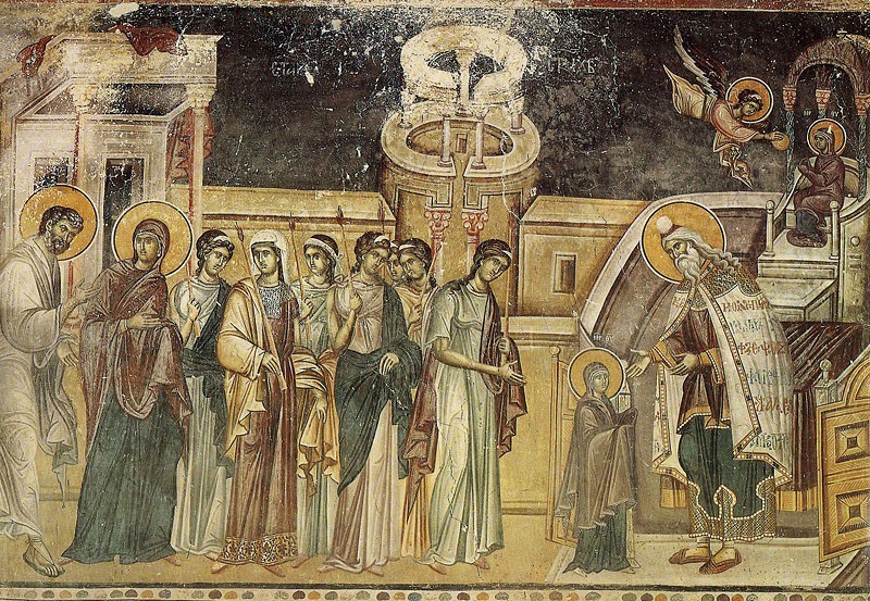 Когда Деве Марии исполнилось три года, Ее благочестивые родители приготовились исполнить свой обет: посвятить Ее Богу. Они одели Ее в лучшие одежды и, провожаемые народом с пением духовных песен, повели в иерусалимский храм. Ее подруги-сверстницы, как и Сама Мария, шли с зажженными свечами в руках. Навстречу им вышли с пением из храма священники во главе с первосвященником.