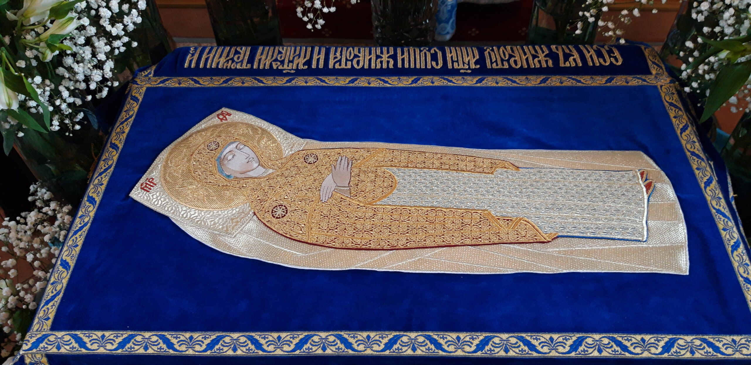 Велича́ем Тя,/ Пренепоро́чная/ Ма́ти Христа́ Бо́га на́шего,/ и всесла́вное сла́вим// Успе́ние Твое́.