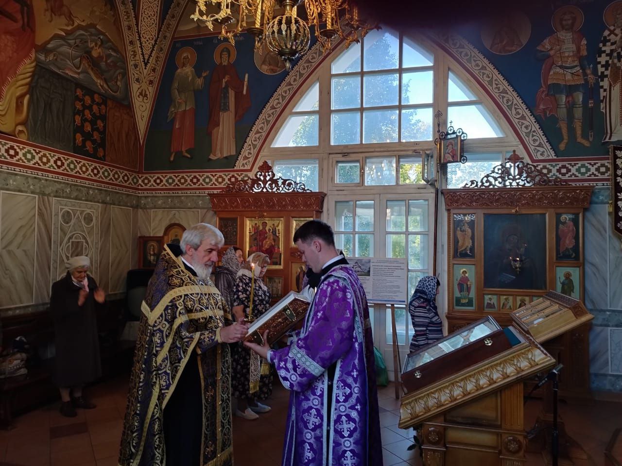 Предте́чево сла́вное усекнове́ние/ смотре́ние бысть не́кое Боже́ственное,/ да и су́щим во а́де Спа́сово пропове́сть прише́ствие./ Да рыда́ет у́бо Ироди́я,/ беззако́нное уби́йство испроси́вши:/ не зако́н бо Бо́жий, ни живы́й век возлюби́,// но притво́рный, привре́менный.