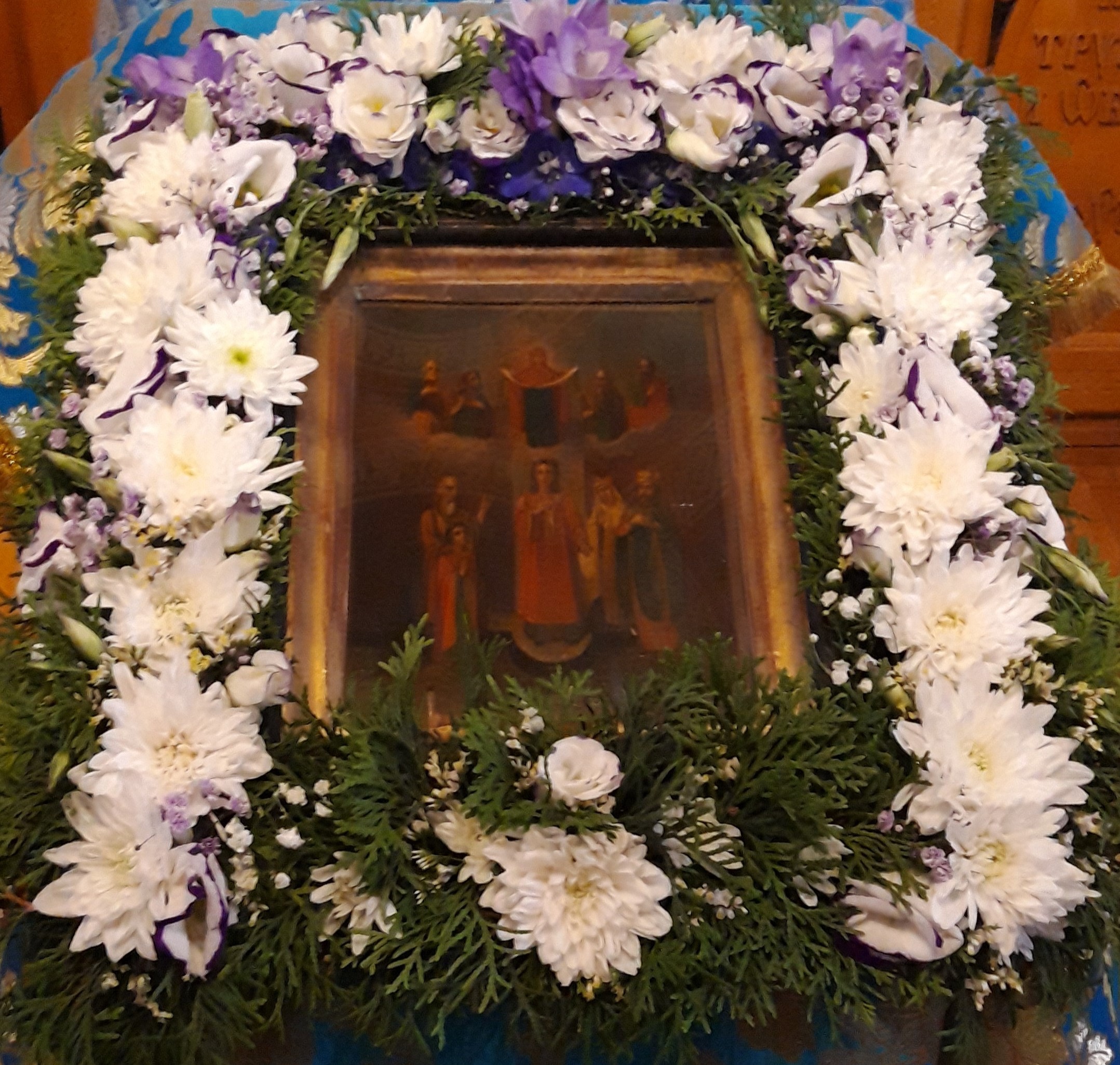Святые Андрей и Епифаний, удостоившиеся созерцать молящуюся Богоматерь, «долгое время смотрели на распростертое над народом покрывало и на блиставшую наподобие молнии славу Господню; доколе была там Пресвятая Богородица, видимо было и покрывало; по отшествии же Ее, сделалось и оно невидимым, но, взяв его с Собою, Она оставила благодать, бывшую там». Во Влахернской церкви сохранилась память о дивном явлении Богоматери. В XIV веке русский паломник дьяк Александр видел в церкви икону молящейся за мир Пресвятой Богородицы, написанную так, как Ее созерцал святой Андрей. Но Греческая Церковь не знает этого праздника.