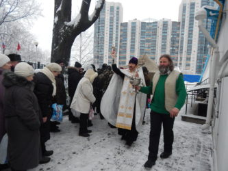 После освящения была организована раздача воды: в ограде храма была установлена обогреваемая палатка с большим баком. Это позволило избежать очередей и всем брать воду в нужном количестве, с благоговением, без суеты.