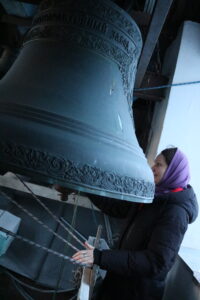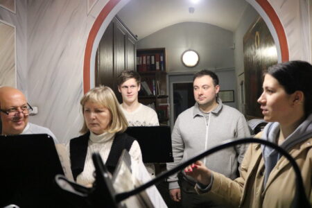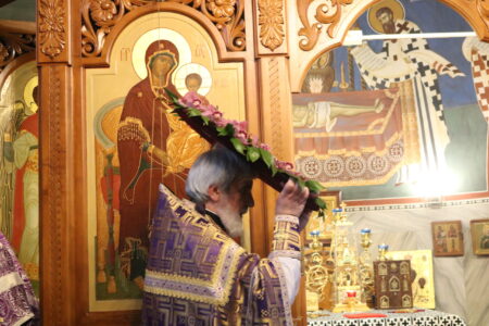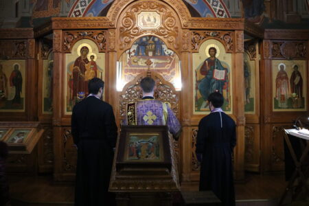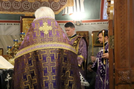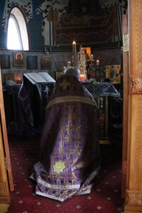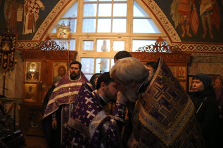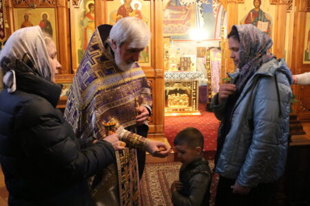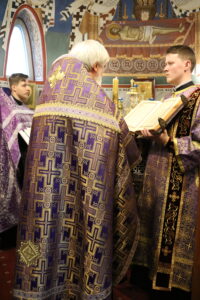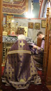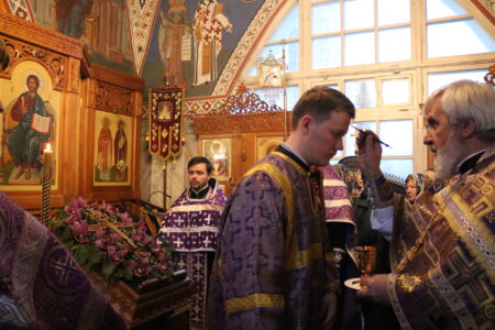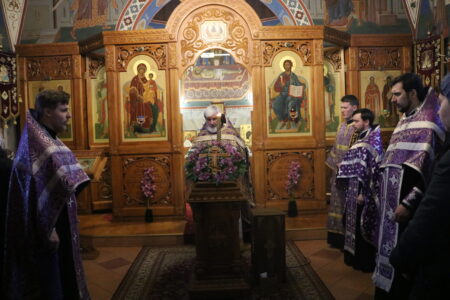 После великого славословия был совершен чин выноса Креста и поклонение ему.