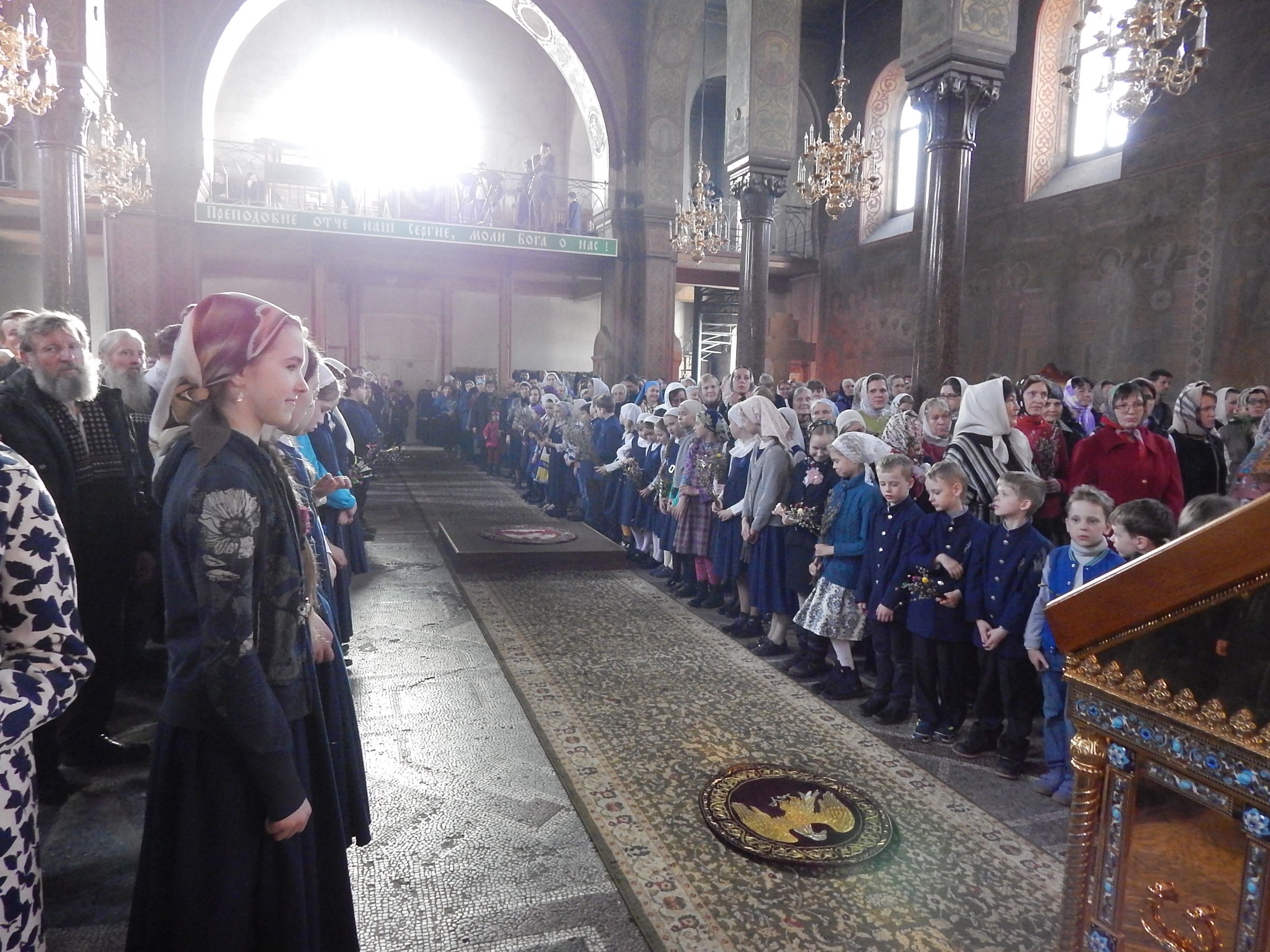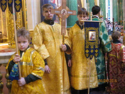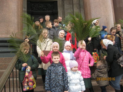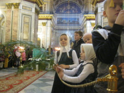 В этот же день учащиеся нашей воскресной школы приняли участие в детском Крестном ходе вокруг Исаакиевского собора. Детский Крестный ход традиционно совершается в день Входа Господня в Иерусалим. В этом году в нем участвовали около 2000 воспитанников православных гимназий и воскресных школ.