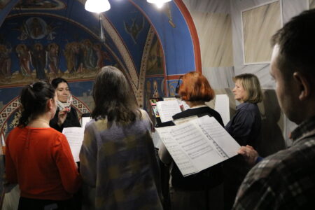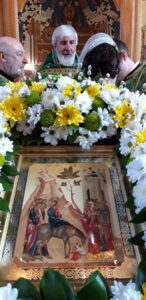 Велича́ем Тя,/ Живода́вче Христе́,/ оса́нна в вы́шних,/ и мы Тебе́ вопие́м:// благослове́н Гряды́й во и́мя Госпо́дне.