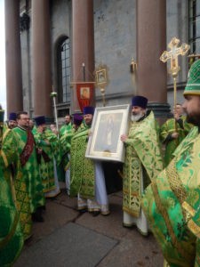 После богослужения под молитвенное пение верующие с хоругвями и иконами совершили крестный ход вокруг собора.