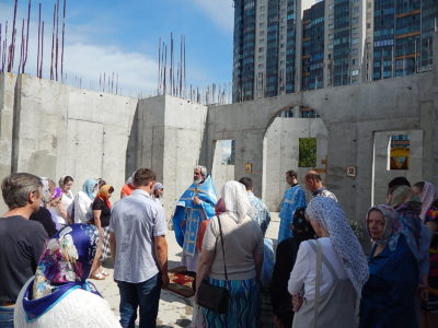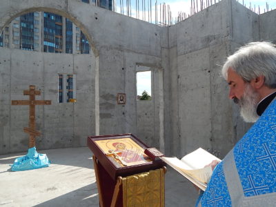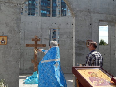 Затем на первом этаже строящегося храма состоялся молебен. Настоятель и прихожане молились о благополучном продолжении строительства храма Всемилостивого Спаса.