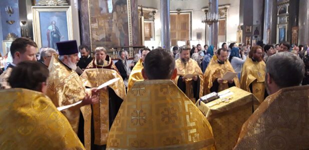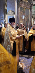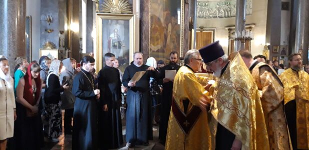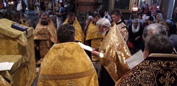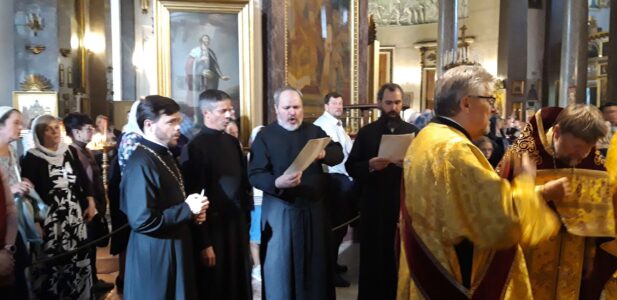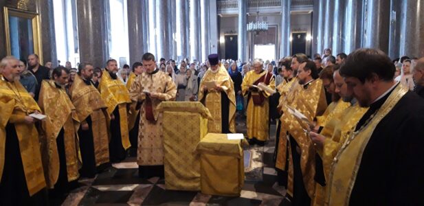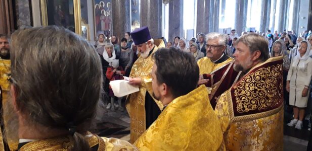 10 сентября 2023 года благочинный Красносельского благочиннического округа протоиерей Михаил Подолей с клириками, певчими и алтарниками благочиния совершили молебен во время пребывания Креста Господня в Казанском кафедральном соборе.