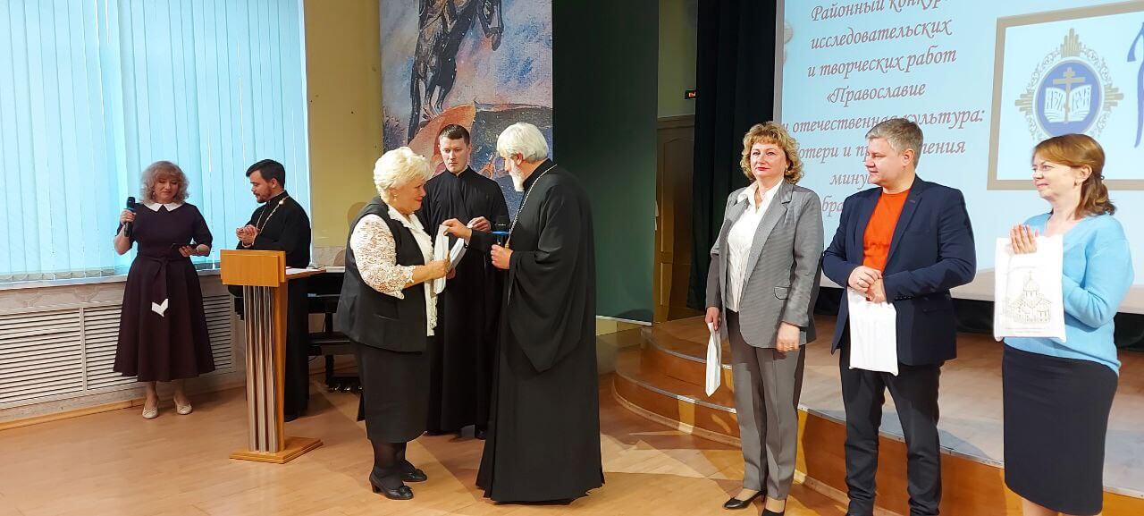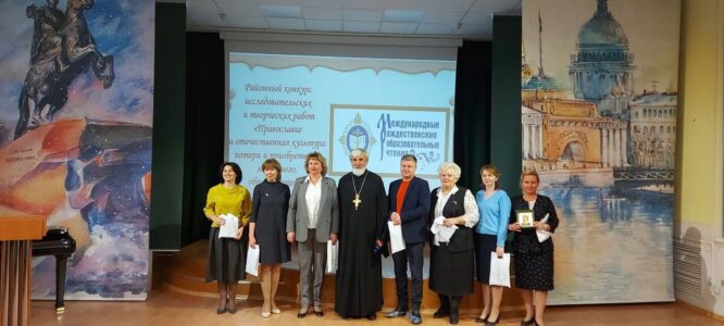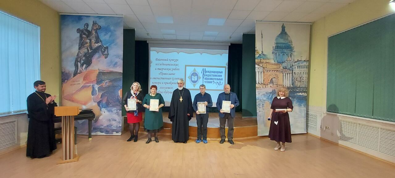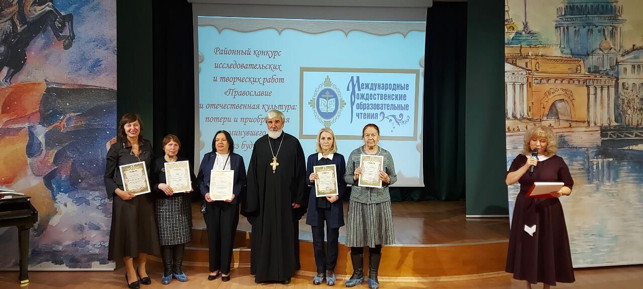 Грамоты за подготовку учащихся к конкурсу исследовательских и творческих работ в рамках Рождественских образовательных чтений «Православие и отечественная культура: потери и приобретения минувшего, образ будущего» учителю истории и культуры школы №217 Прийменко Елене Валерьевне, учителю мировой художественной культуры школы №217 Гавриловой Елене Владимировне, учителю истории школы №414 Денисову Михаилу Павловичу, учителю ОБЖ школы №242 Мизину Николаю Николаевичу.