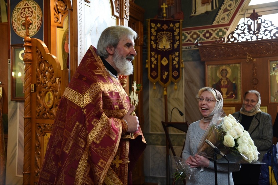 После молебна прихожане поздравили прот. Михаила с 12-летием его служения в храме святого праведного Иоанна Кронштадтского на Кронштадтской площади.
