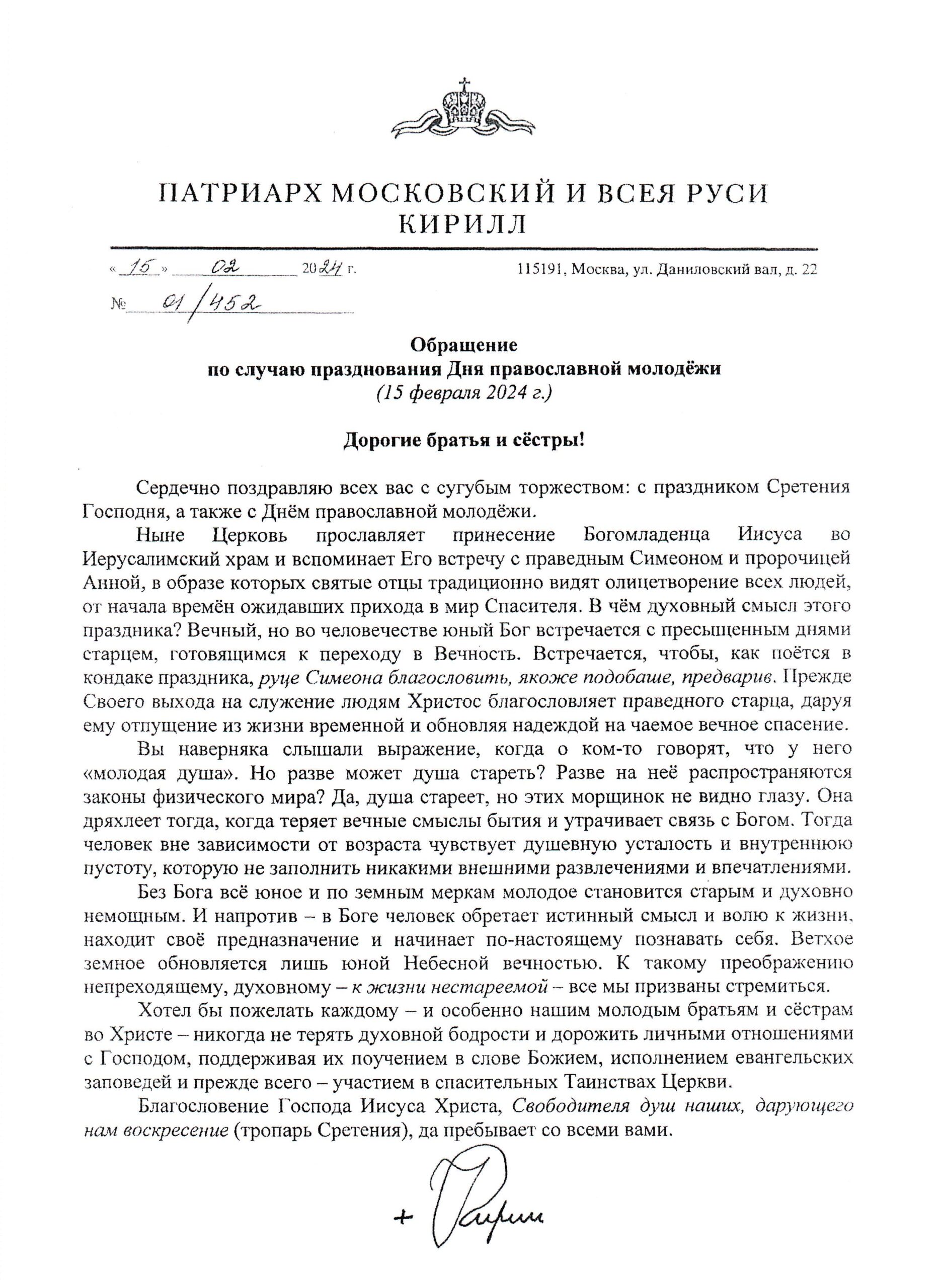 Главная » Приходская жизнь » Обращение Святейшего Патриарха Московского и всея Руси Кирилла по случаю празднования Дня православной молодежи Обращение Святейшего Патриарха Московского и всея Руси Кирилла по случаю празднования Дня православной молодежи
