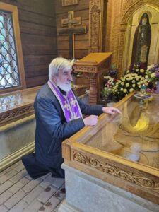 В часовне над местом захоронения преподобного Серафима Вырицкого по благословению протоиерея Георгия Преображенского, настоятеля храма в честь Казанской иконы Божией Матери, протоиерей Михаил Подолей совершил молебен. Перевод осуществила Виктория Подолей. Паломники приложились к гробнице Преподобного и помазались освящённым елеем. После, для путешественников была предложена трапеза. Отец Михаил поздравил всех с завершением путешествия к Мемориалу, благодаря которому, милостью Божией, паломники приобщились всенародной скорби о мирных жертвах нашего народа в годы Великой Отечественной войны, и к одному из самых почитаемых мест Санкт-Петербургской митрополии — пребыванию честных мощей преподобного Серафима Вырицкого в п. Вырица Гатчинского р-на Ленинградской области, рядом с храмом в честь Казанской иконы Божией Матери. Он пожелал сохранить в памяти светлые чувства и переживания об этой поездке.