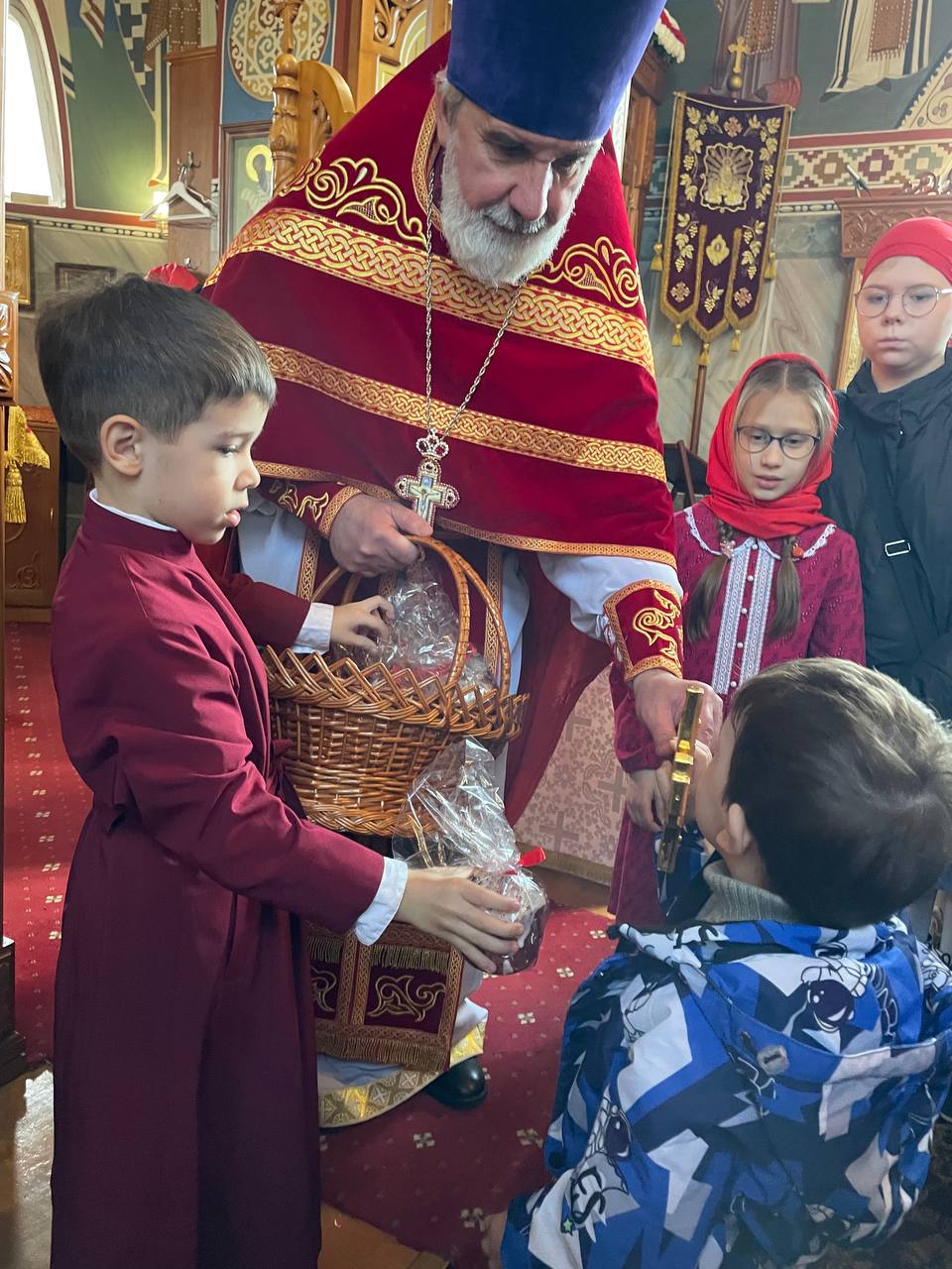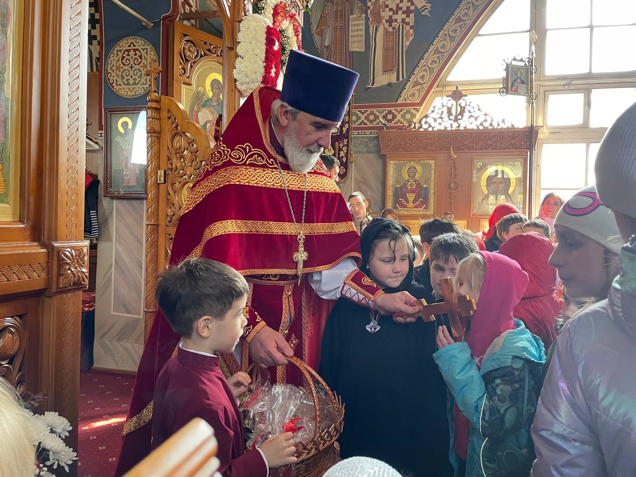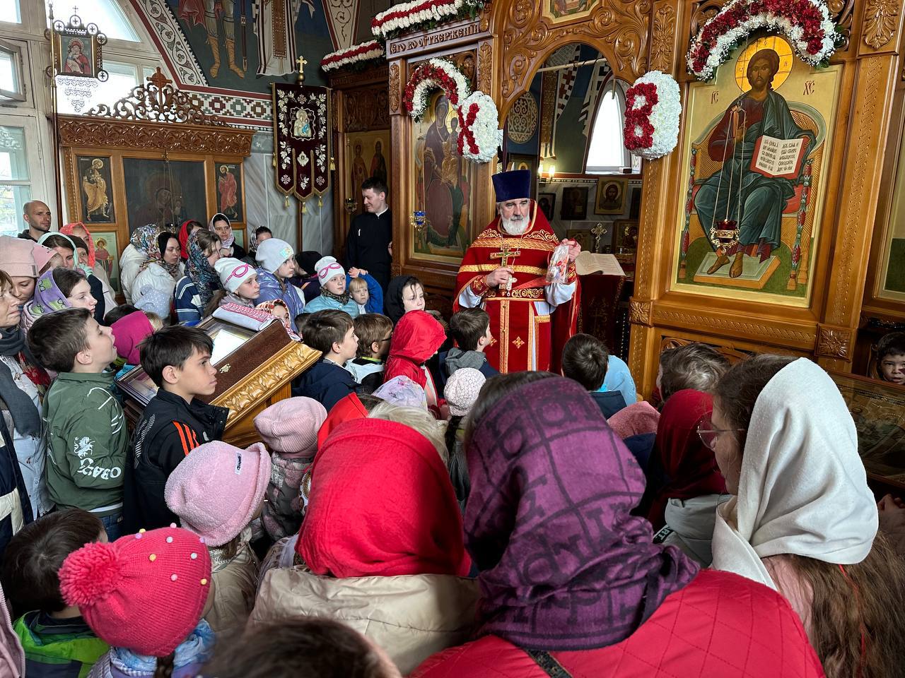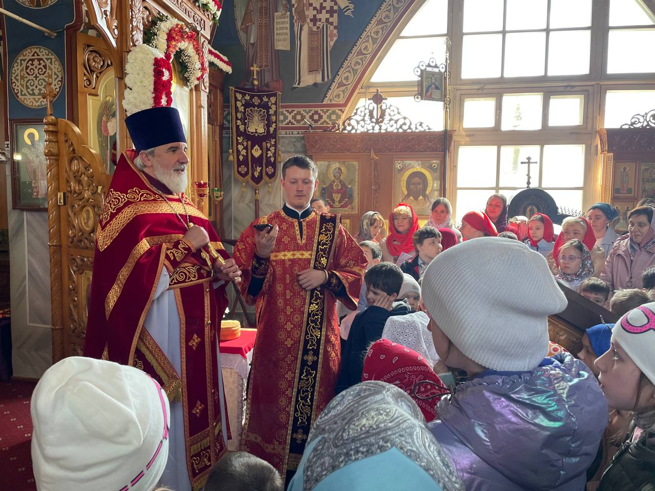 После богослужения настоятель храма обратился к прихожанам и воспитанникам воскресной школы «София» с поздравлением.