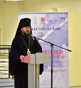 Приветствие митрополита Санкт-Петербургского и Ладожского Варсонофия зачитал секретарь епархиального совета по культуре иерей Илия Макаров. «Тема революции спустя столетие по-прежнему разделяет наш народ, и в этом заключена величайшая трагедия. Рана, нанесенная обществу, до сих пор остается не залеченной, — говорилось в послании. — Церковь Христова — сосуд истины. Она основана на фундаменте истины, живет истиной, следует за истиной. Поэтому Рождественские чтения должны стать площадкой, лишенной идеологии, пропаганды и политики», — сказано в обращении.