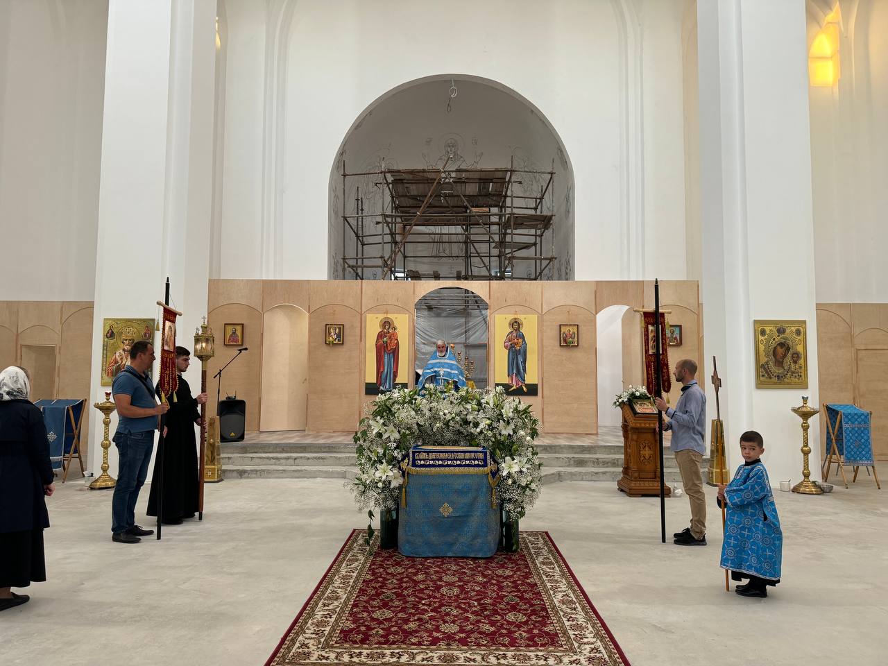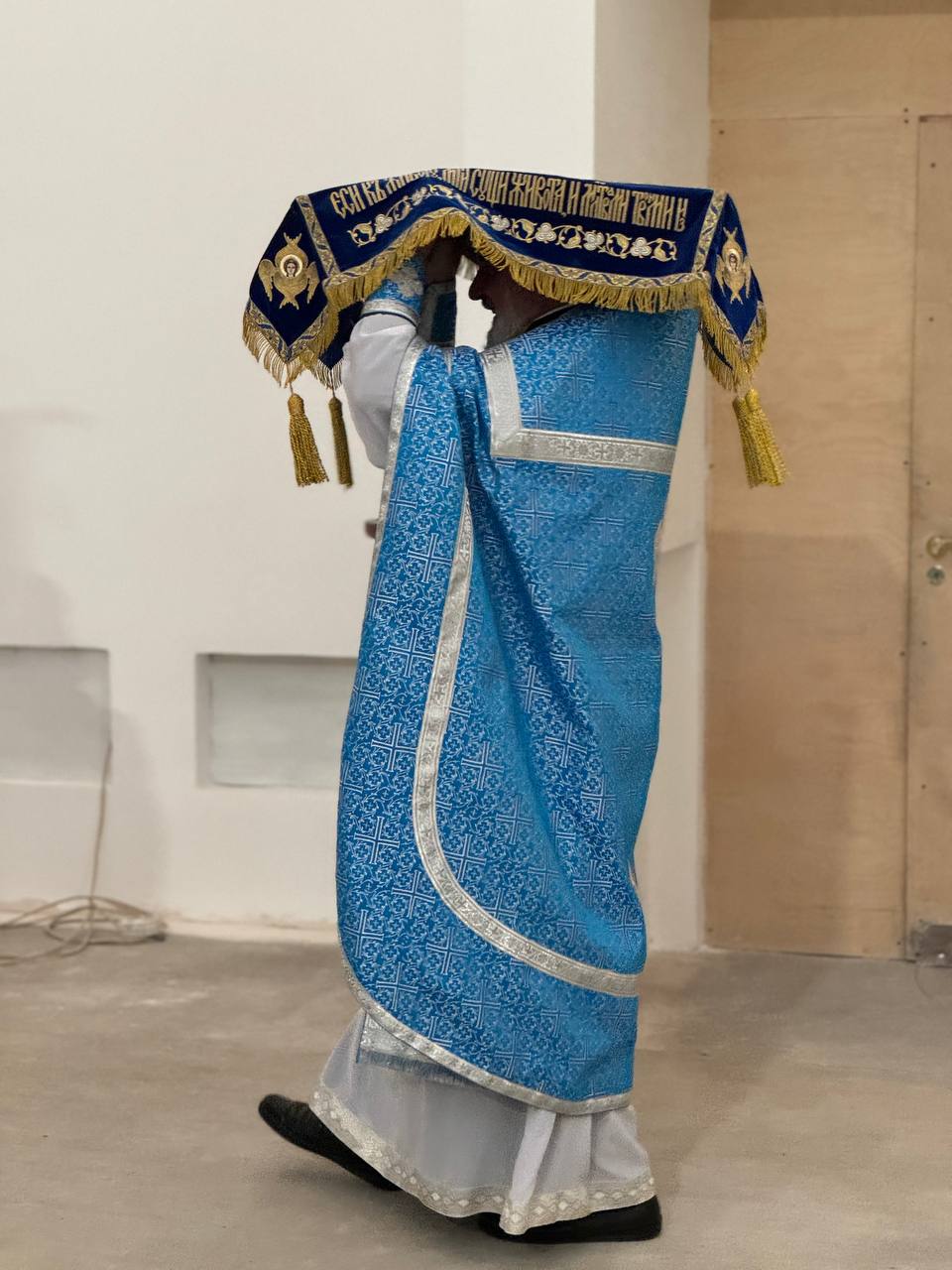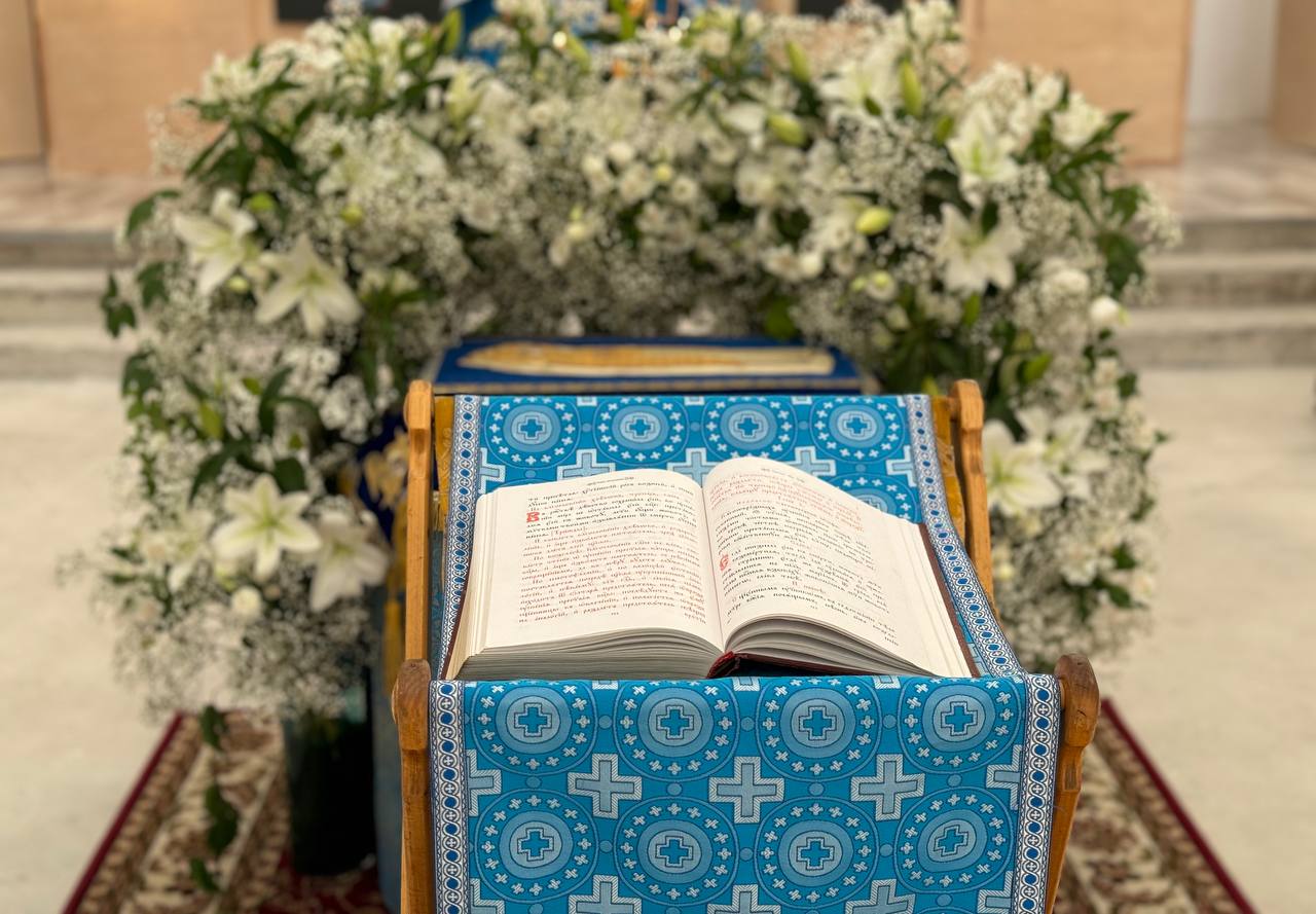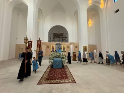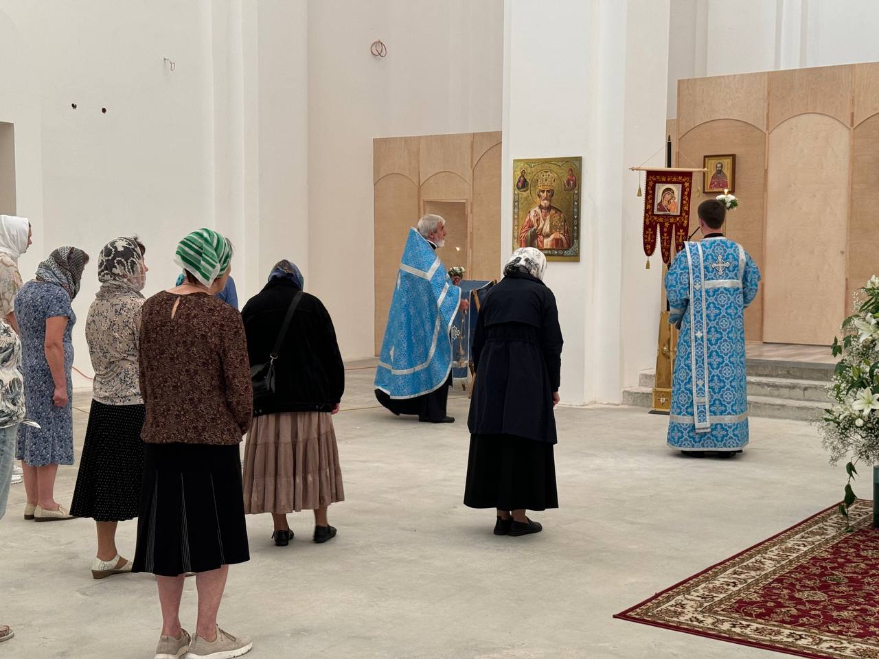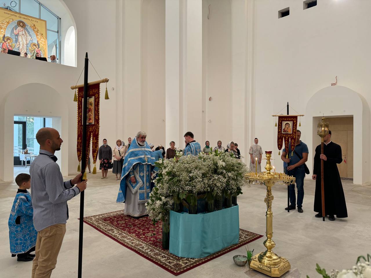 Был совершен крестный ход по периметру внутри храма с плащаницей Богородицы.