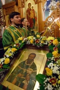 Верующим раздали небольшие иконы преподобного Силуана Афонского.