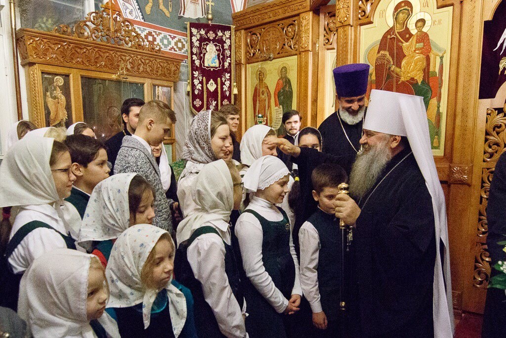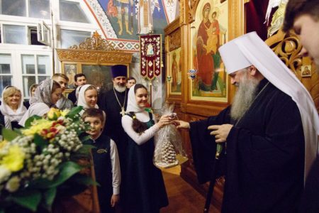 Воспитанники воскресной школы исполнили поэтическую композицию, посвященную святому Иоанну Кронштадтскому, поздравили владыку с праздником и преподнесли ему пряничную елочку.