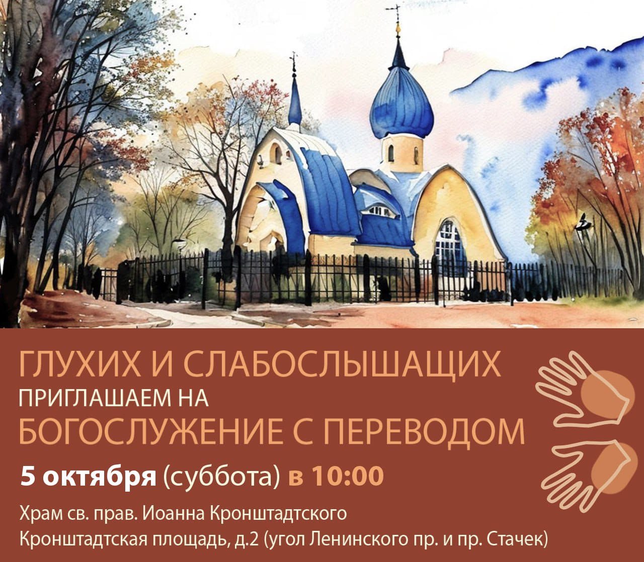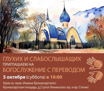 5 октября 2024 года, в субботу Седмицы 15-й по Пятидесятнице, в храме святого праведного Иоанна Кронштадтского на Кронштадтской площади была совершена Божественная литургия с сурдопереводом для глухих и слабослышащих прихожан. Богослужение совершил настоятель храма протоиерей Михаил Подолей.