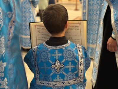 Де́ва днесь предстои́т в це́ркви/ и с ли́ки святы́х неви́димо за ны мо́лится Бо́гу,/ А́нгели со архиере́и покланя́ются,/ апо́столи же со проро́ки ликовству́ют:// нас бо ра́ди мо́лит Богоро́дица Преве́чнаго Бо́га.