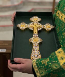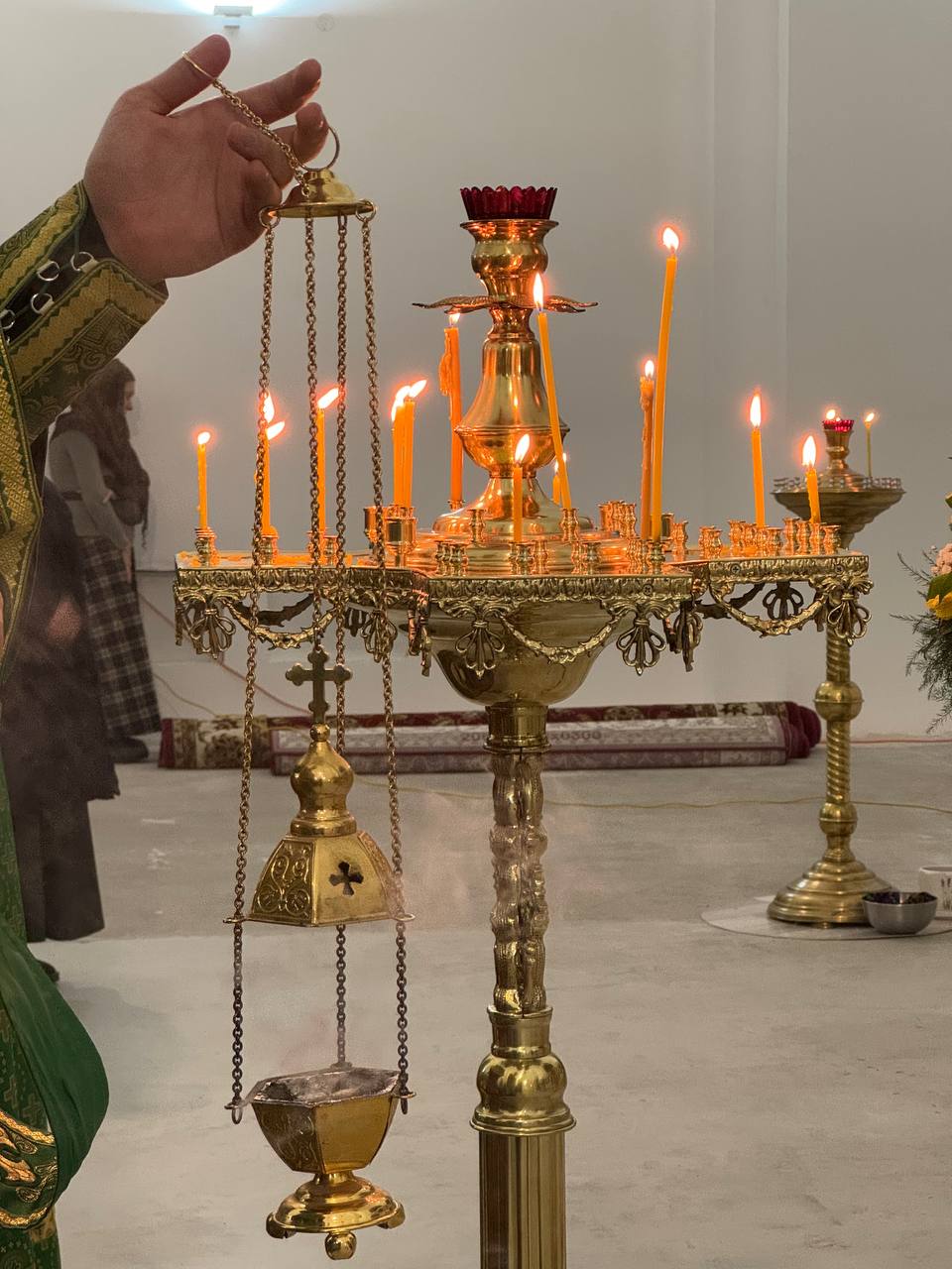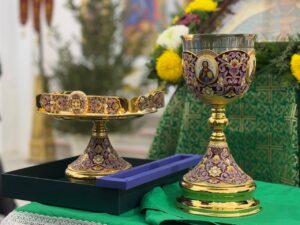 По окончании Всенощного бдения были освящены новые богослужебные сосуды, подаренные добрыми людьми для храма Всемилостивого Спаса: потир, дискос, звездица, лжица и напрестольный крест.