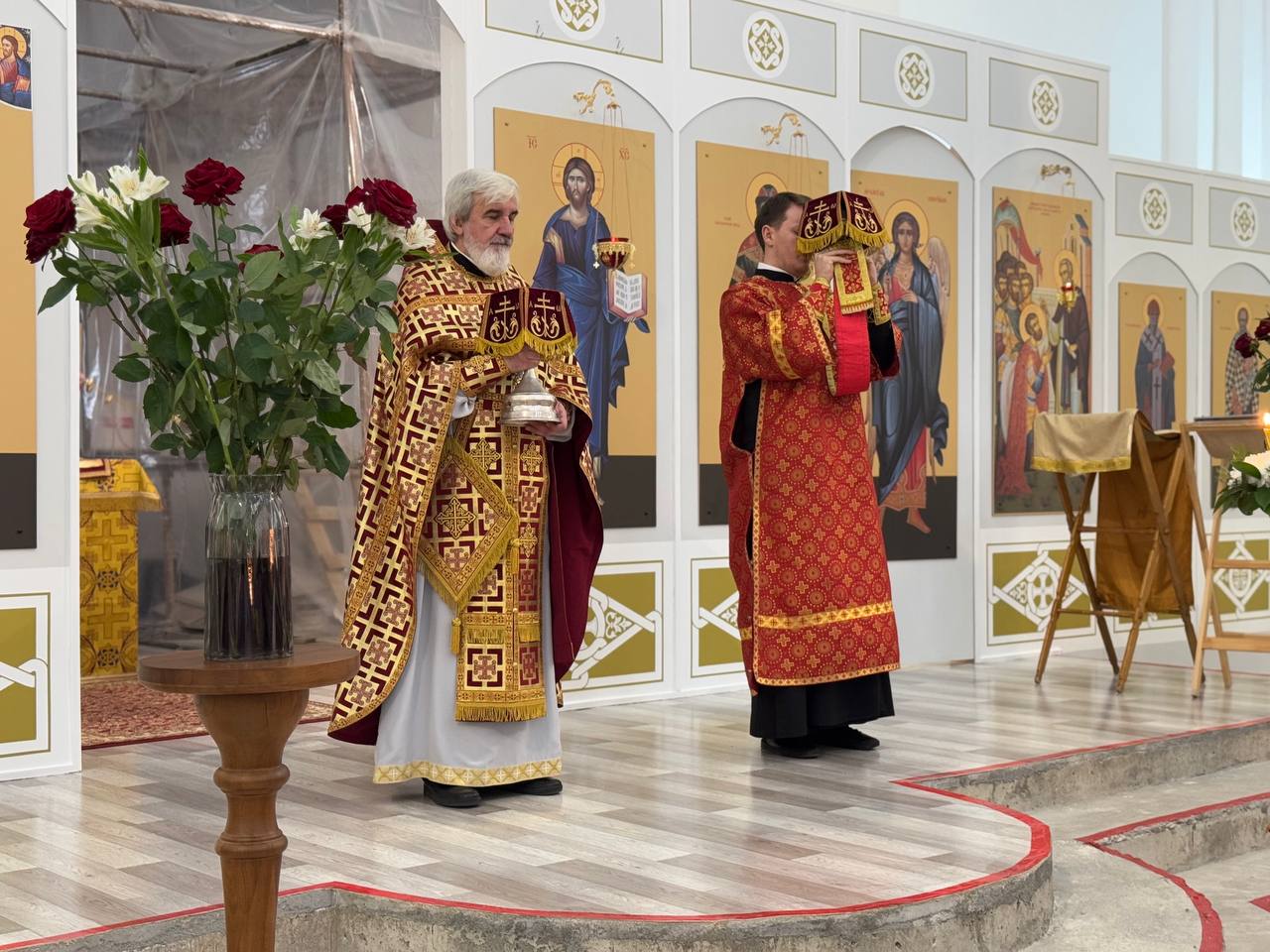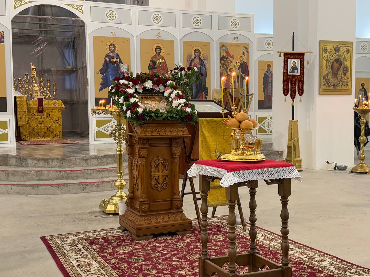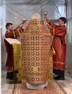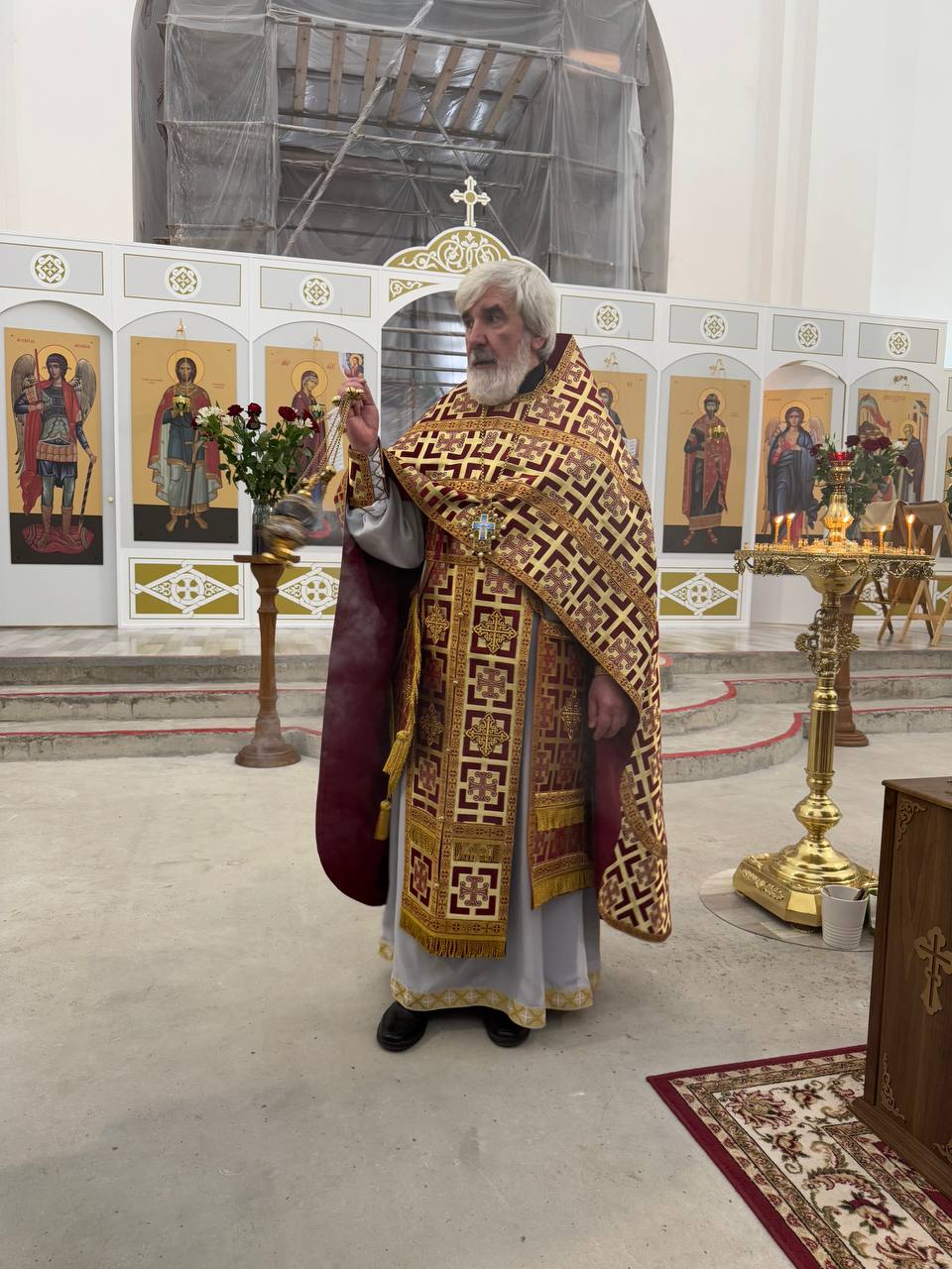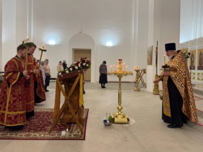 Вечером, накануне праздника, Всенощное бдение в строящемся храме Всемилостивого Спаса совершил также настоятель храма протоиерей Михаил Подолей в сослужении клира.