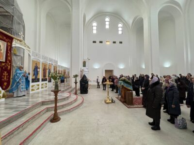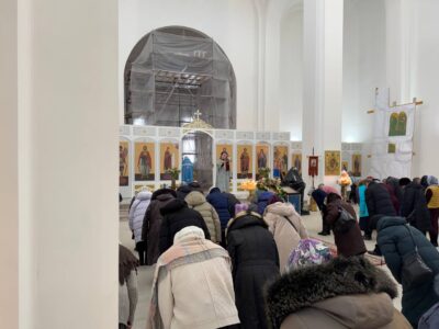 16 февраля 2025 года, в Неделю о блудном сыне, Божественную литургию в строящемся храме Всемилостивого Спаса совершил настоятель храма протоиерей Михаил Подолей в сослужении клира.