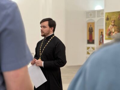 С приветственным словом перед учащимися выступил директор Центра духовной культуры и образования Красносельского благочиннического округа, клирик храма иерей Константин Подолей. В своём выступлении отец Константин рассказал об истории праздника Сретения Господня, его значении в жизни каждого человека, предании Церкви о Симеоне Богоприимце, а также напомнил учащимся, как важно встретиться с Господом в своей жизни.