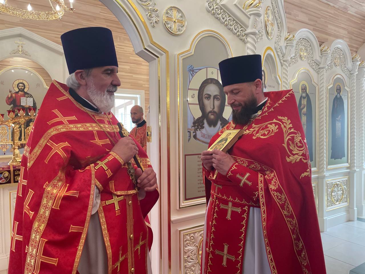 Отец Михаил в своем слове тепло поздравил настоятеля храма, клириков и всех прихожан с престольным праздником и преподнес настоятелю в дар икону святого праведного Иоанна Кронштадтского.