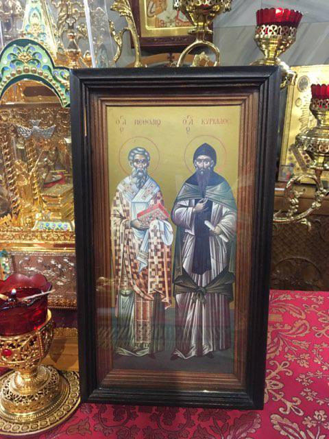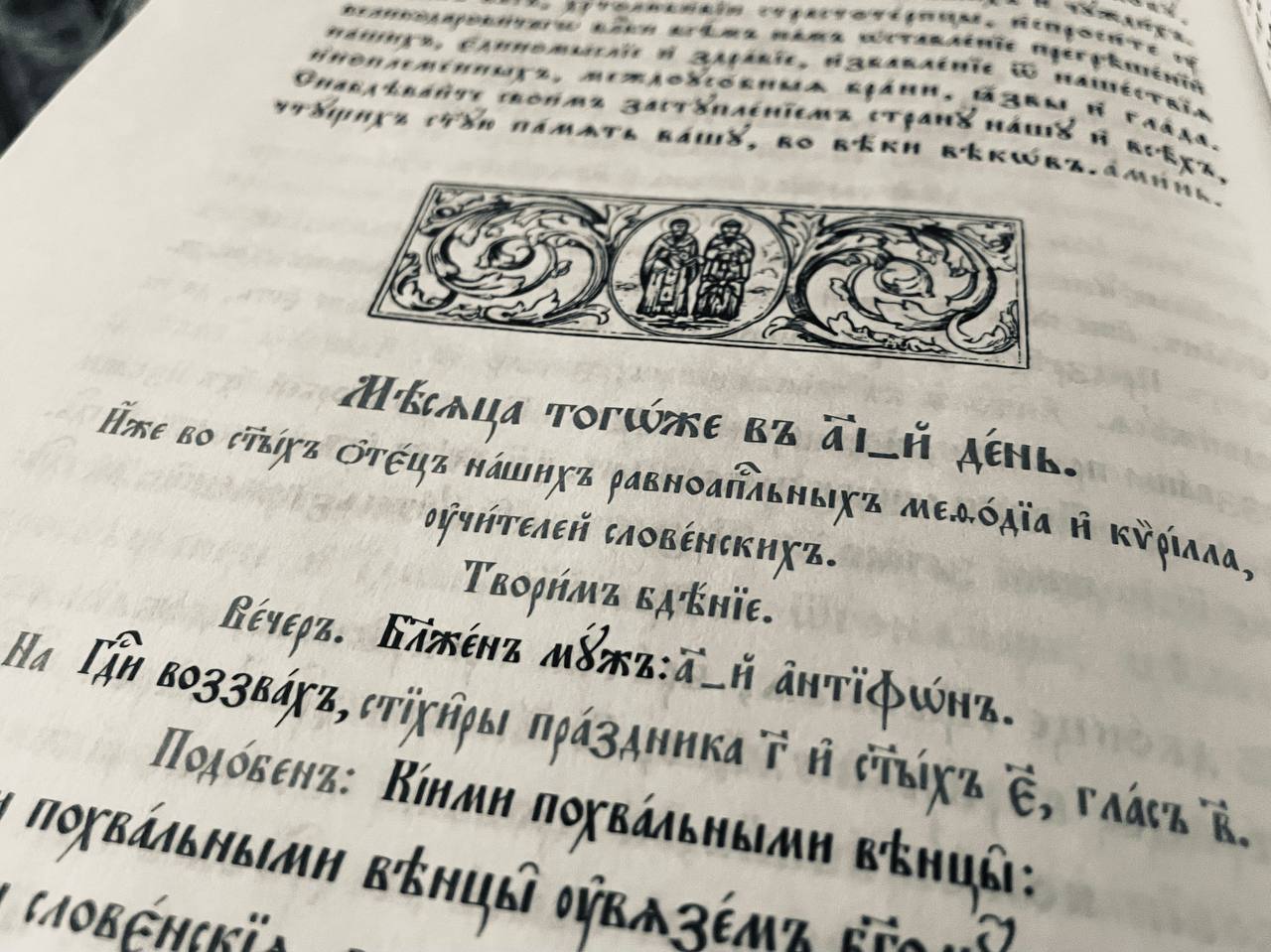 Свяще́нную дво́ицу просвети́телей на́ших почти́м,/ Боже́ственных писа́ний преложе́нием исто́чник богопозна́ния нам источи́вших,/ из него́же да́же додне́сь неоску́дно почерпа́юще,/ ублажа́ем вас, Кири́лле и Мефо́дие,/ Престо́лу Вы́шняго предстоя́щих// и те́пле моля́щихся о душа́х на́ших.