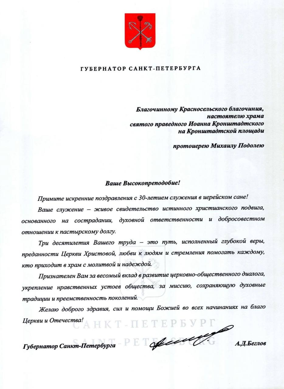 Губернатор Санкт-Петербурга Александр Дмитриевич Беглов поздравил благочинного Красносельского округа, настоятеля храма святого праведного Иоанна Кронштадтского протоиерея Михаила Подолея с 30-летием служения в иерейском сане