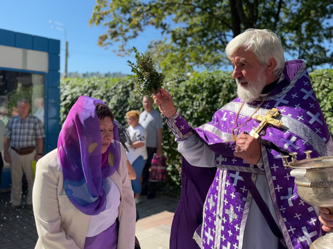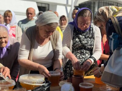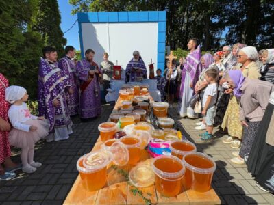 По случаю престольного праздника был совершен малый крестный ход к храму святого праведного Иоанна Кронштадтского на Кронштадтской площади, где было совершено малое освящение воды и меда нового урожая.