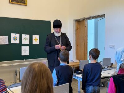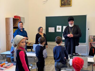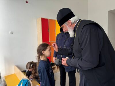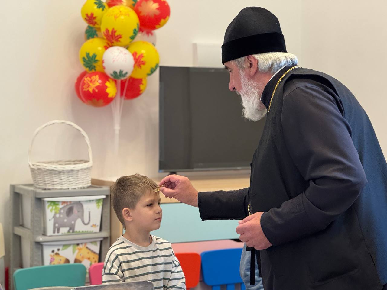 Перед началом занятий директор воскресной школы протоиерей Михаил Подолей помазал ребят елеем, освященным на Святой Земле.