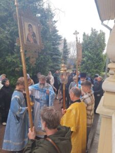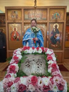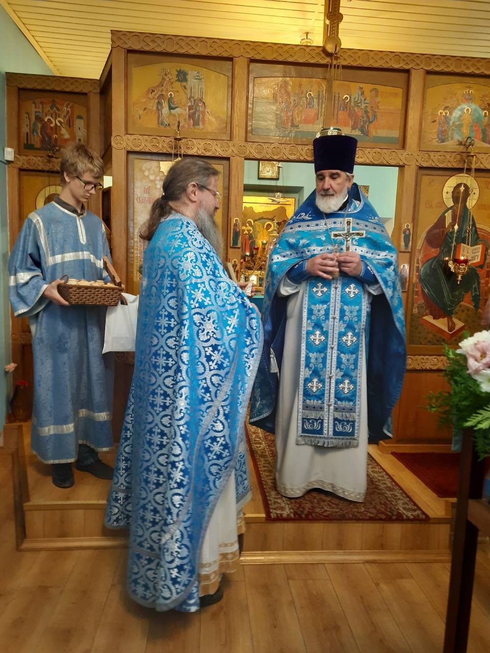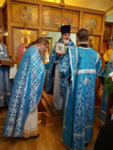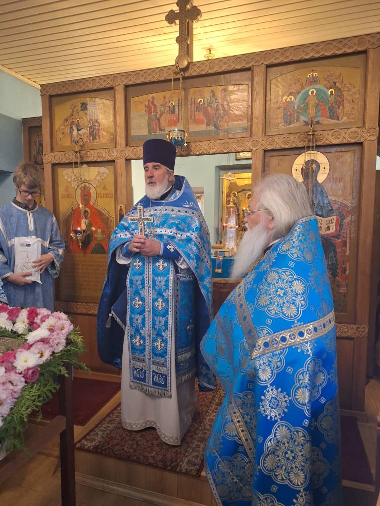 Отец Михаил тепло поздравил настоятеля и прихожан с престольным праздником, пожелал Божией помощи и заступничества Пресвятой Богородицы в их служении. Всем присутствующим в храме отец Михаил раздал крестики, привезенные со Святой Земли.