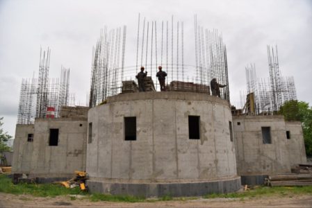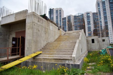 На настоящий момент связаны каркасы колонн второго этажа и каркасы стен второго этажа (вспомогательных помещений, внутренних лестничных клеток). Завезена арматура для устройства каркаса внутренних лестниц.