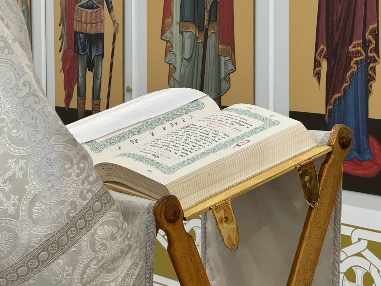 Написова́шеся иногда́ со ста́рцем Ио́сифом,/ я́ко от се́мене Дави́дова, в Вифлее́ме Мариа́м,/ чревонося́щи безсе́менное Рожде́ние./ Наста́ же вре́мя рождества́,/ и ме́сто ни еди́ноже бе обита́лищу,/ но я́коже кра́сная пала́та верте́п Цари́це показа́шеся.// Христо́с ражда́ется пре́жде па́дший воскреси́ти о́браз.