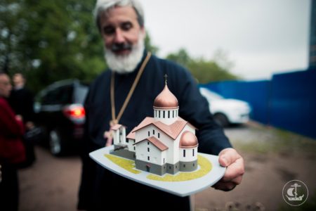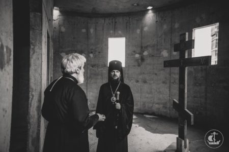 Перед отъездом владыки настоятель храма протоиерей Михаил Подолей показал ему строящийся рядом храм в честь Всемилостивого Спаса.