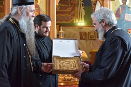 Епископ Иоанникий с делегацией приехал в Санкт-Петербургскую епархию и город Санкт-Петербург для участия в конференции, посвященной дням Сербской культуры в Санкт-Петербурге. За это время Владыка посетил Коневецкий монастырь и по дороге в Пюхтицкий монастырь заехал в наш храм. В память о визите лично отцу Михаилу и его семье Владыка преподнес в дар икону Божией Матери.