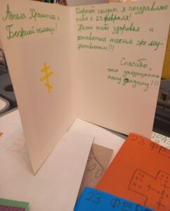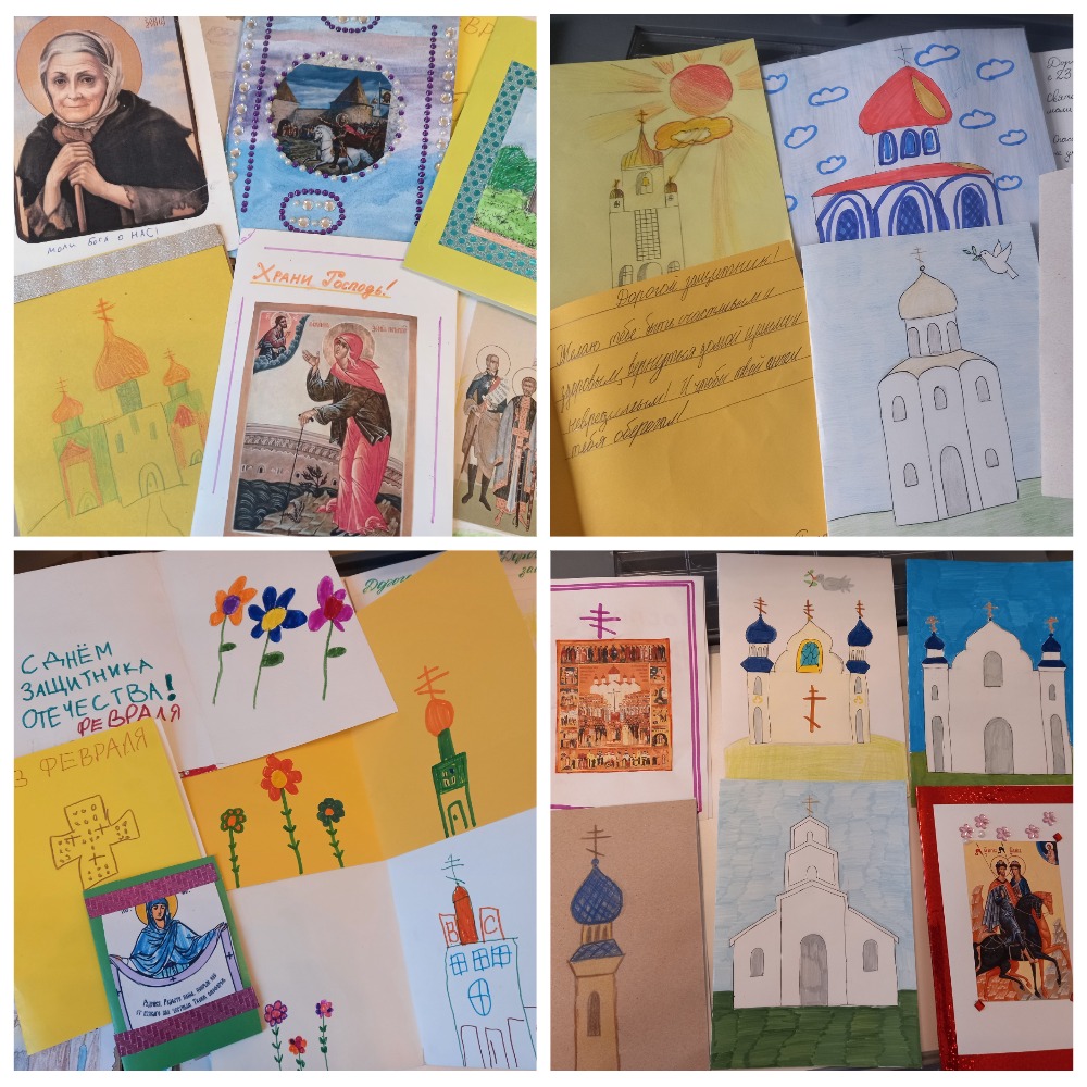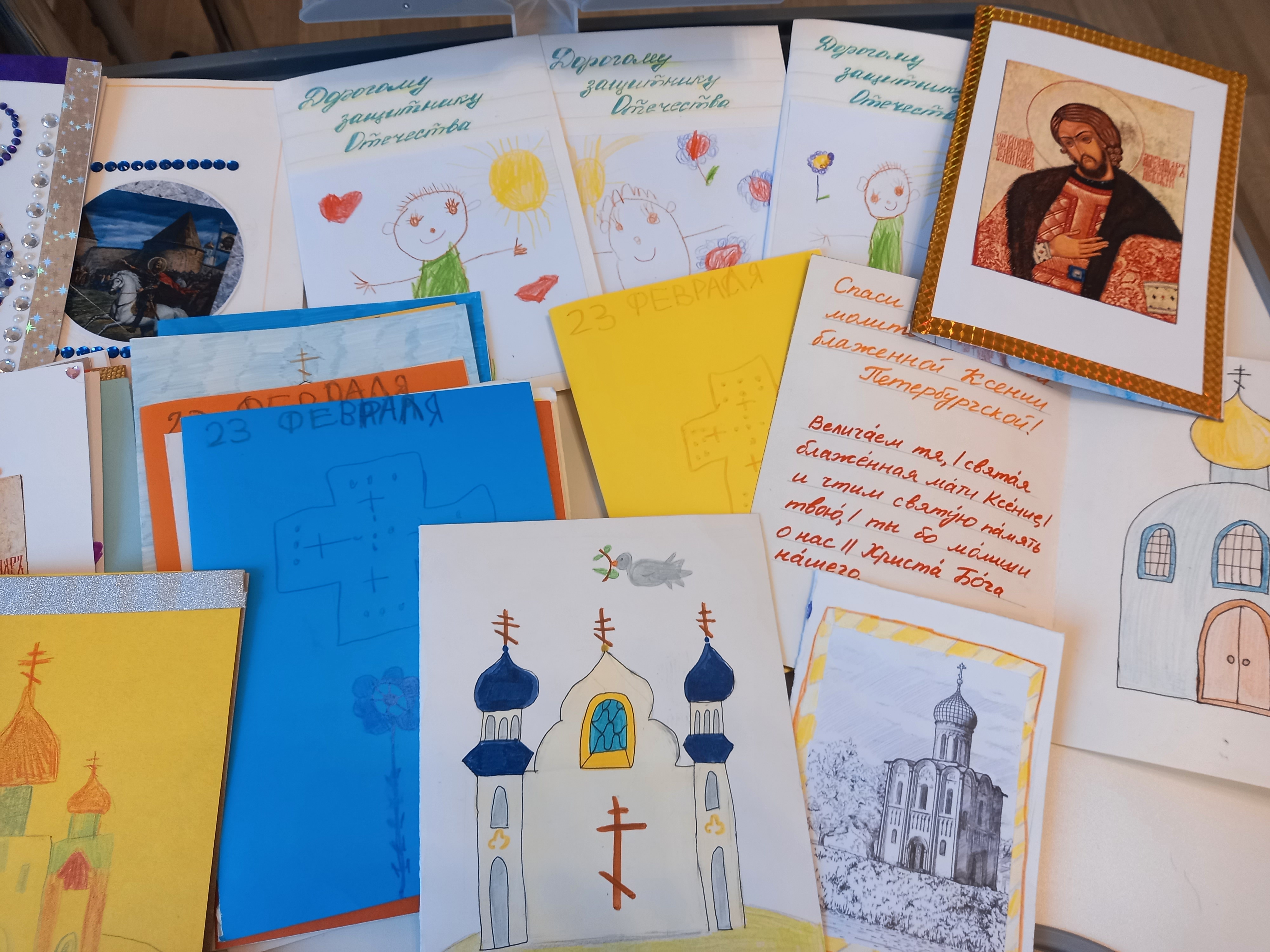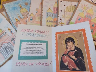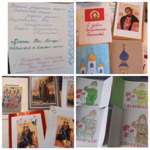 По благословению благочинного Красносельского округа, настоятеля прихода святого праведного Иоанна Кронштадтского на Кронштадтской площади протоиерея Михаила Подолея воспитанники воскресной школы «София» вместе со своими родителями и учителями ко Дню защитника Отечества подготовили и передали поздравительные открытки защитникам нашего Отечества, находящимся на лечении в госпитале, с пожеланиями скорейшего выздоровления и всего самого доброго. Участие приняли также воспитанники детских садов Красносельского района.
