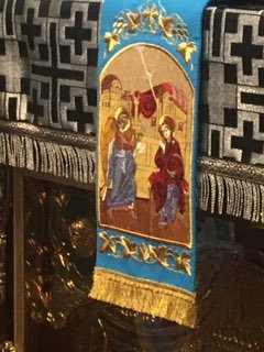 Ирмос, глас 4: Я́ко одушевле́нному Бо́жию киво́ту,/ да ника́коже ко́снется рука́ скве́рных;/ устне́ же ве́рных Богоро́дице немо́лчно,/ глас А́нгела воспева́юще, с ра́достию да вопию́т:// ра́дуйся, Благода́тная, Госпо́дь с Тобо́ю.