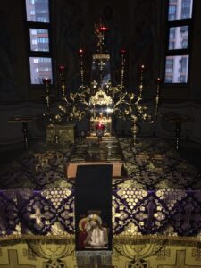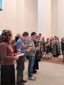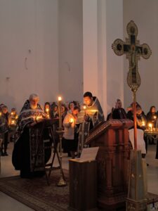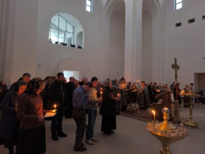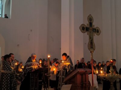 Вечером 9 апреля 2026 г. в храме Всемилостивого Спаса настоятель храма протоиерей Михаил Подолей в сослужении клира совершил утреню Великой Пятницы с чтением 12 Евангелий Страстей Христовых.