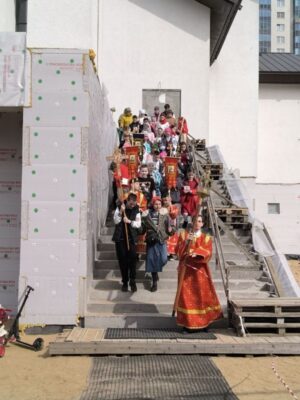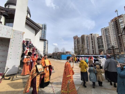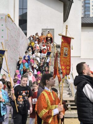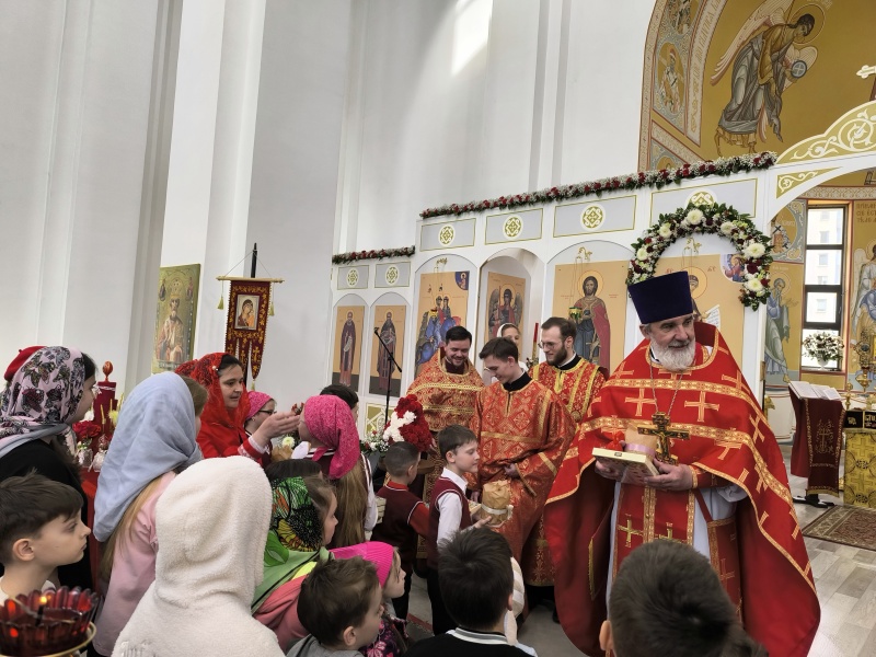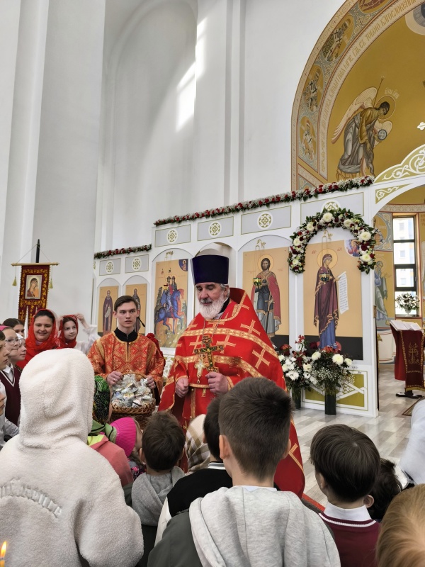 В Пасхальное воскресенье днем в храме Всемилостивого Спаса настоятель храма, благочинный Красносельского округа протоиерей Михаил Подолей в сослужении клира совершил Пасхальную вечерню и Крестный ход для детей благочиния.