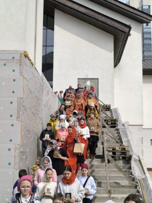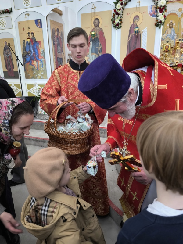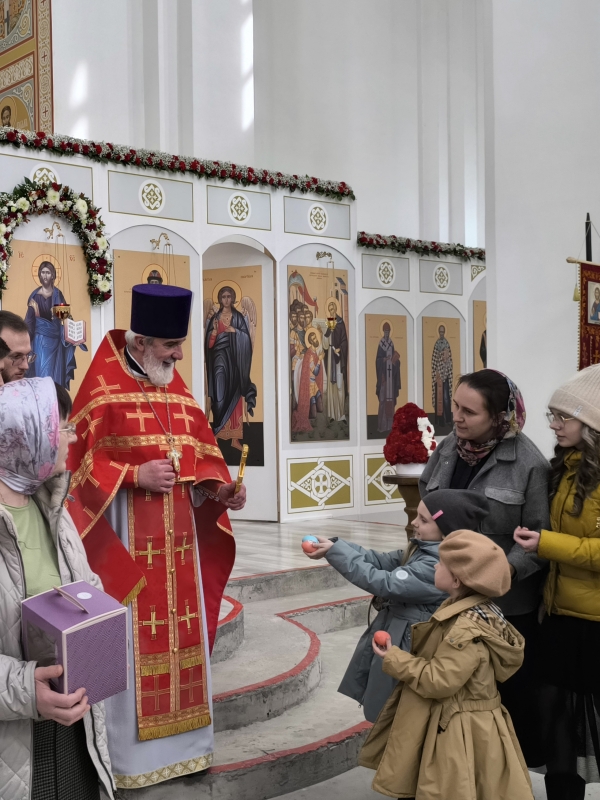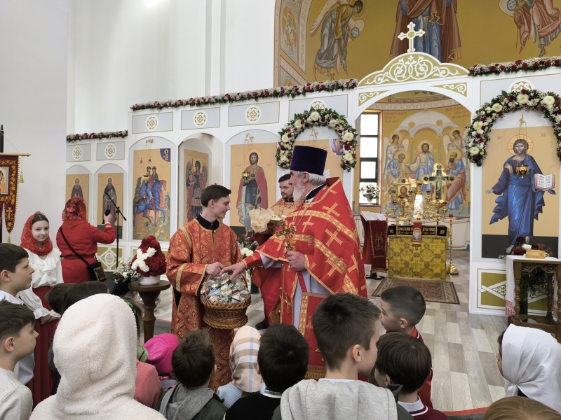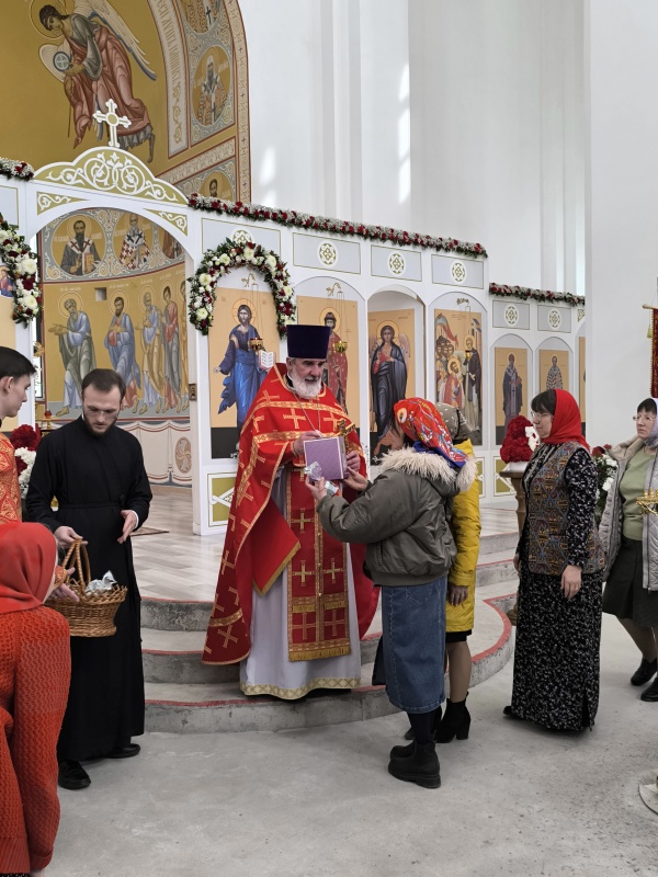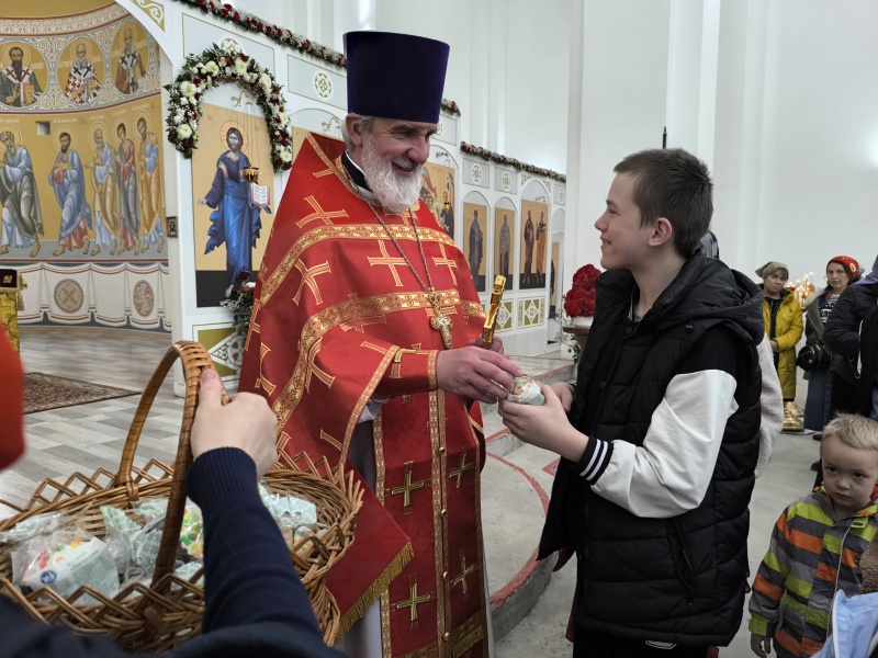 Отец Михаил рассказал детям о важности Пасхи, поздравил присутствующих со Светлым Христовым Воскресением. Всем присутствующим детям были подарены пасхальные подарки.